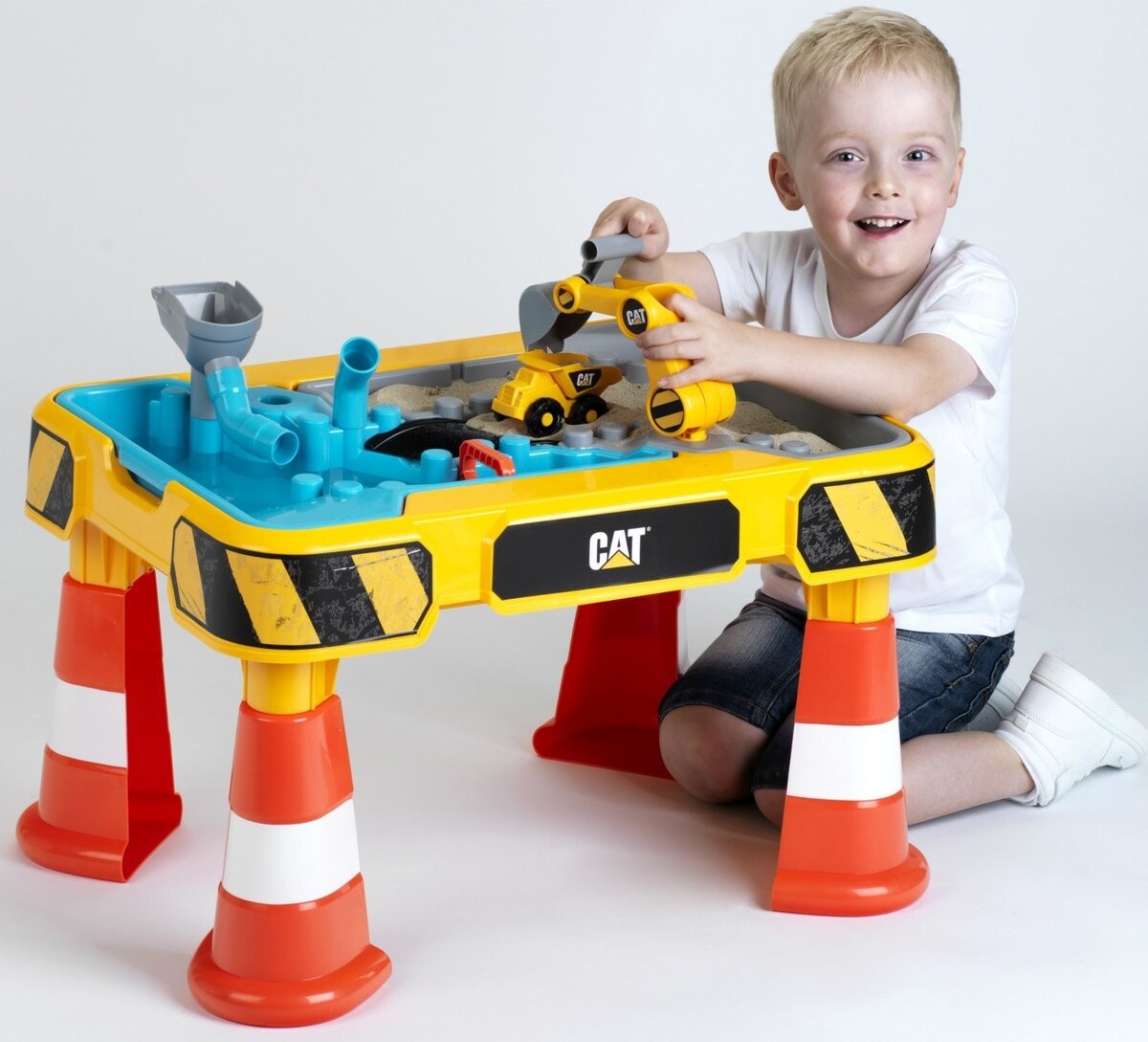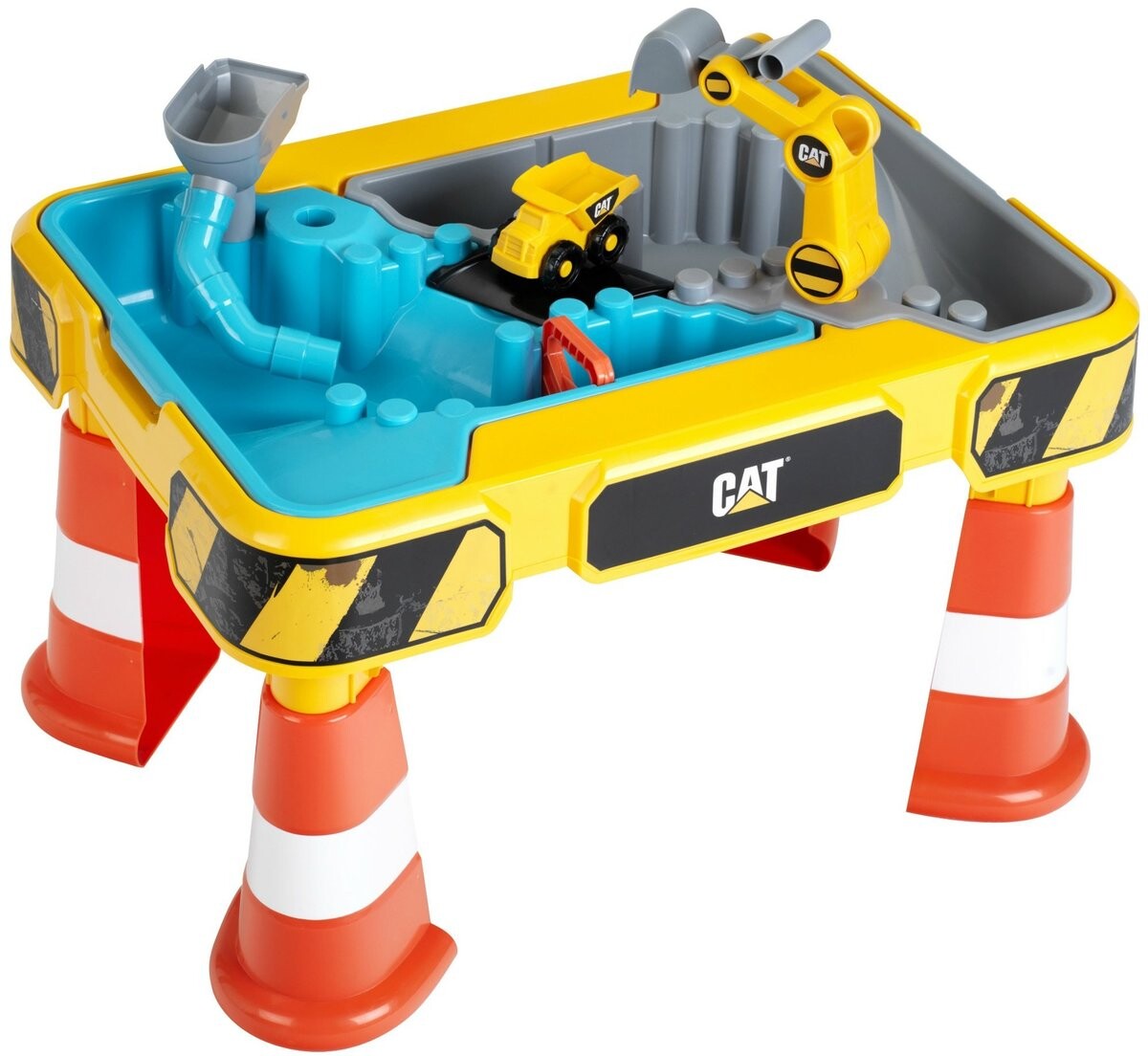 Большой игровой набор состоит из желтой платформы, поставленной на четыре ножки. Ножки напоминают дорожные конусы, а край платформы украшен узором из строительной ленты. Ставим на платформу две миски – синюю и серую. Синий предназначен для наполнения водой, а серый – песком. Теперь ничто не мешает открыть нашу стройку! В комплект также входит самосвал. с помощью которого мы будем перевозить груды песка. Благодаря воронке, трубам и стреле экскаватора, которую можно закрепить на столе, перед нами откроется множество забавных возможностей.