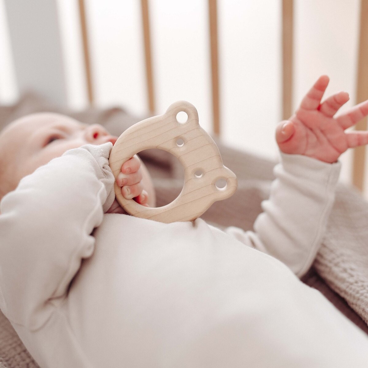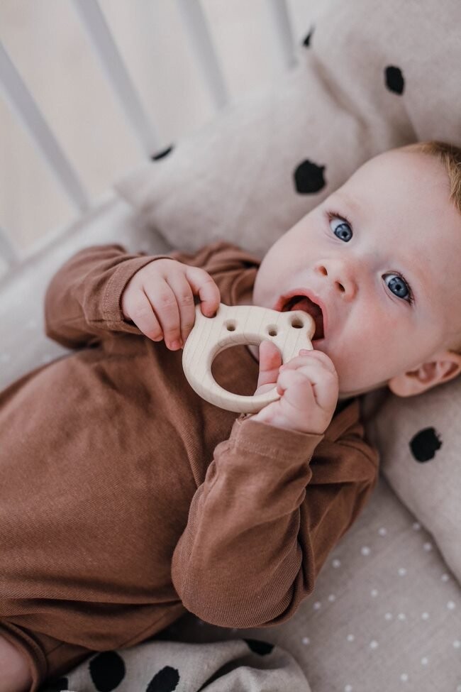 Деревянный прорезыватель ooh noo FROG не прыгает, но он, безусловно, поможет облегчить боль при прорезывании зубов.