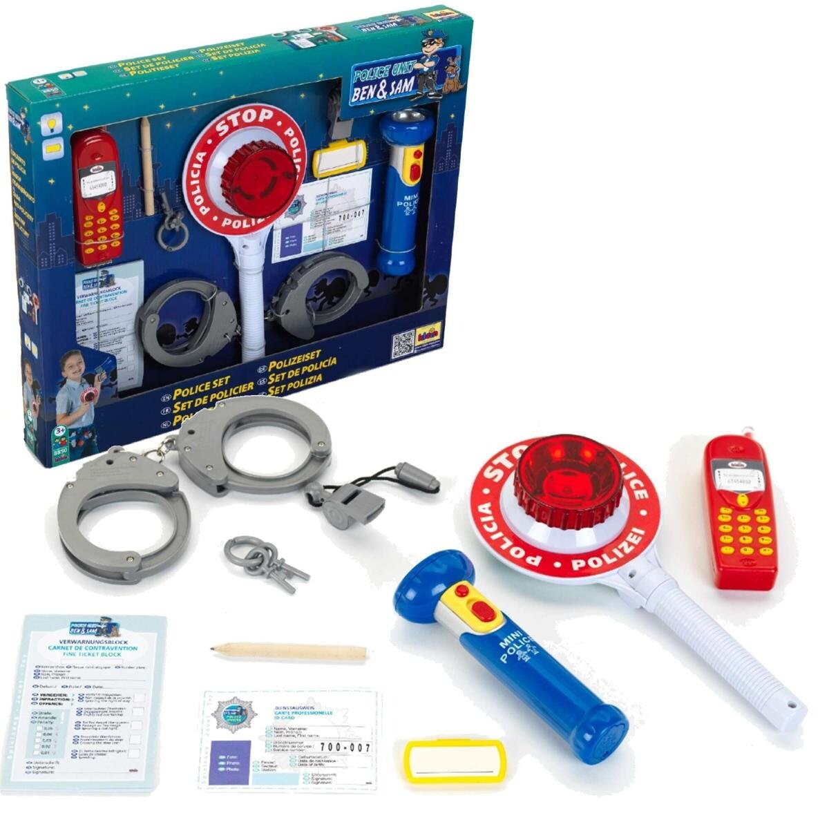 В комплект входят: удостоверение полицейского, именной бейдж, билетный блокнот, карандаш, наручники, ключи от наручников, игрушечный свисток, фонарик, макет мобильного телефона и полицейский леденец игрушка требуется использование 4 батареек AA/R6 (не входят в комплект) размеры упаковки: 40 x 32 x 4 7 см цвет карандаша может отличаться от представленного на фото длина фонарика: 15 смигрушка предназначен для детей от 3 лет. леткод производителя: 8850Доставка товаров осуществляется курьером или на пункт выдачи заказов.