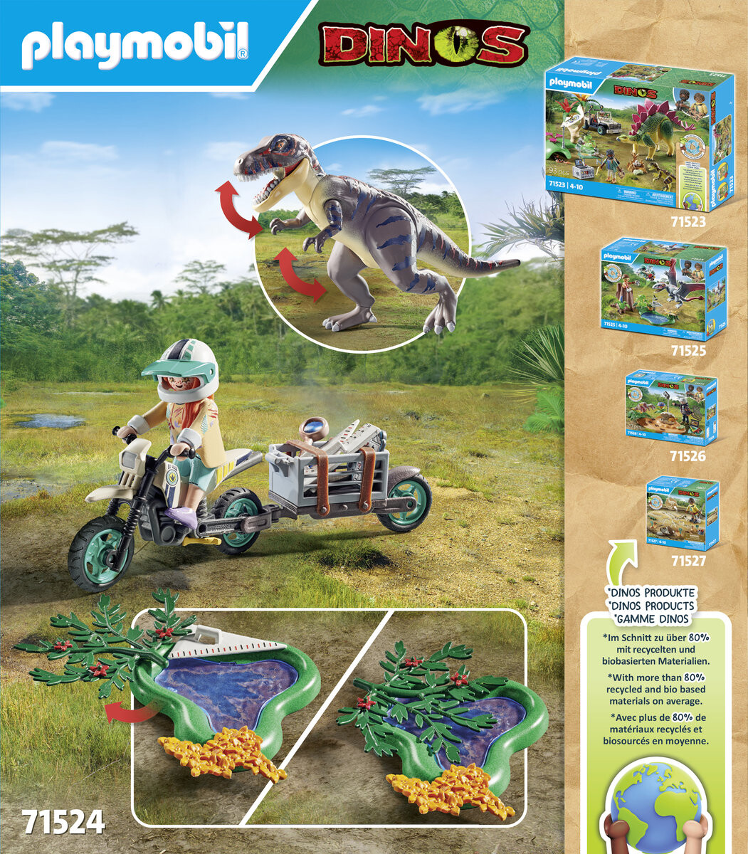 Испытайте уникальное развлечение динозавров с помощью набора PLAYMOBIL Search for the T-Rex. Исследователь отправляется на мотоцикле с прицепом искать следы тиранозавра. Она быстро натыкается на останки костей и гигантский след, но когда перед ней появляется гигантский тираннозавр, ей приходится сохранять спокойствие. Серия PLAYMOBIL Dinos приглашает детей от 4 лет погрузиться в интересные ролевые приключения и испытать очарование гигантских ящериц дома. Подробности о продукте: - Хорошо оснащенный набор, в который входят исследователь PLAYMOBIL, Ти-Рекс, мотоцикл с прицепом, лужа со следом, лупа, фотоаппарат. карта и другое исследовательское оборудование. - Ти-Рекс может двигать конечностями и головой, а также открывать нижнюю челюсть. - Включает карточки знаний с интересными фактами о динозаврах. - Наборы PLAYMOBIL Dinos в среднем более чем на 80% состоят из переработанных и биологических материалов.