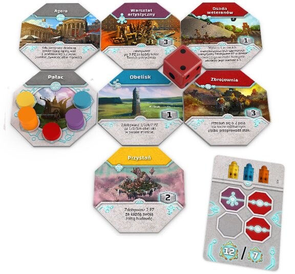 Игры Origins основаны на распределении рабочих. Они позволяют нам посещать места встреч (принося ресурсы, дополнительные кубики и продвигаясь по храмовым и военным путям) или закрывающие районы нашего города. Каждый игрок начинает с города, состоящего из двух плиток: агоры и дворца. По ходу игры к ним будут добавляться новые здания с особыми способностями. благодаря чему территория будет расширяться и крепнуть. Почему вам понравится эта игра?