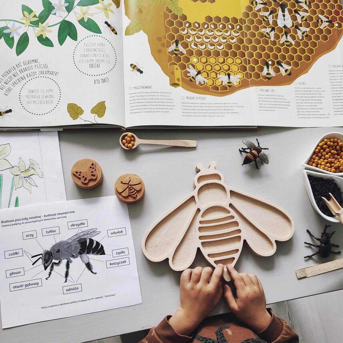 Пчелка идеально подойдет для сенсорных игр и тренировки маленьких ручек. Он будет полезен в первую очередь для весенних игр, но вы можете использовать его и в качестве обучающего пособия. Вы успешно обсудите строение пчел, виды пчел и даже схему опыления. Вместе с ульем это отличный обучающий набор в стиле Монтессори.