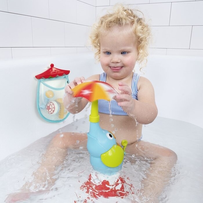 Эта игрушка для ванны на батарейках имеет до 4 аксессуаров, которые создают разные забавные эффекты воды. Слон, стоящий присосавшись к ванне, служит душем, поднимающим воду, а на его хобот мы можем надеть зонтик - разбрызгивая воду. продолжение трубы в виде душа, или самый крутой эффект - труба и шар, которые вместе создают потрясающий эффект. Шар вращается при размещении на трубе благодаря особой конструкции игрушки.