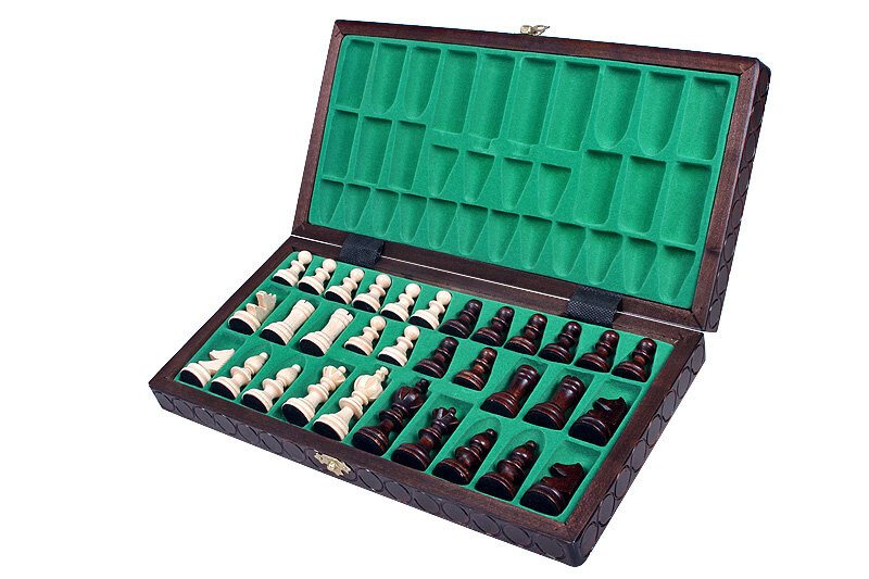 Раскрашенная вручную, складная шахматная шкатулка, оснащенная специальной вставкой для хранения фигур (каждая фигура имеет свое место).