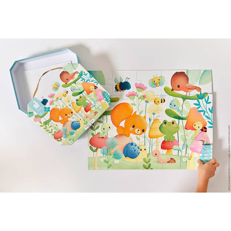 Набор пазлов «Друзья из сада» в чемодане от французского бренда JANOD состоит из 20 элементов, которые, соединяясь друг с другом, создают красивую, богатую деталями картину, изображающую очаровательных животных, обитающих в сад, в том числе: в . белка, птица, бабочка, улитка, сверчок, лягушка, божья коровка, дождевой червь или пчела.