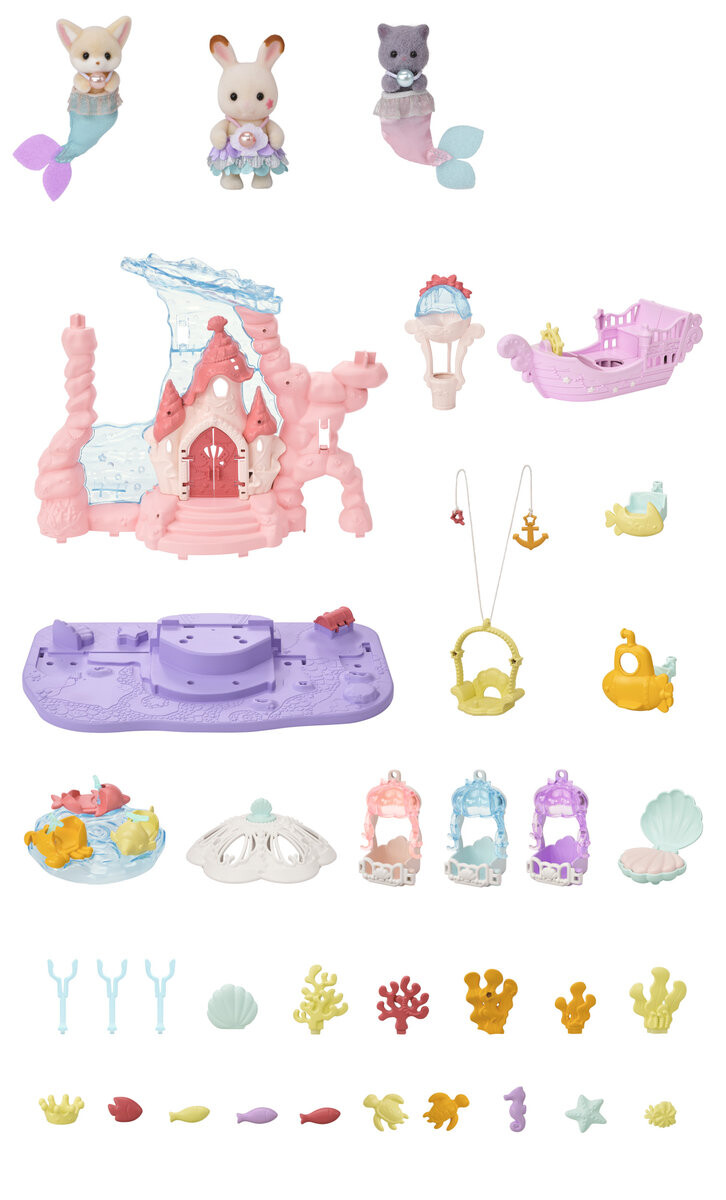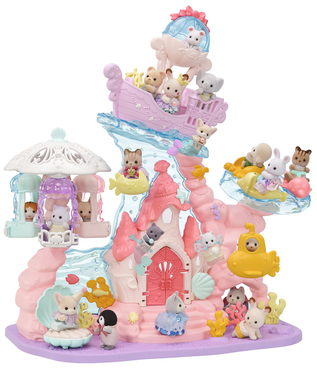 Чудесный Дворец Русалочек доставит массу радости всем любителям страны Sylvanian Families. Достопримечательностей здесь столько, что их сложно сосчитать. Канатная дорога доставит малышей на самую вершину и спустит их вниз. Морская карусель доставит массу удовольствия детям, которые любят кататься! Дети смогут плавать на желтой подводной лодке и на воздушном шаре. который несет большую лодку, открывается чудесный вид на всю землю. Здесь также есть сундук с сокровищами, кроватка в форме ракушки для отдыха малышей, красивая открывающаяся входная дверь и множество других забавных аттракционов. В набор также входят три очаровательные детские фигурки, покрытые мягким бархатным мехом. Маленькая пустынная лиса и маленький персидский котенок, одетые как русалки, с красивыми перепончатыми хвостами. Фигурки и аксессуары из набора можно комбинировать с другими наборами, домиками и аксессуарами Sylvanian Families. Дворец Русалочки Sylvanian Families является частью серии парков развлечений. Игрушки Sylvanian Families отличаются высочайшим качеством изготовления и исключительным вниманием к деталям. У фигурок подвижные головы. руки и ноги. Рекомендуется детям от 3 лет.