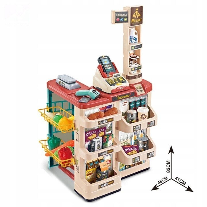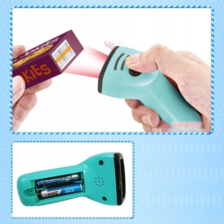 Множество полок в супермаркете позволяют красиво организовать ваш магазин. В комплект входит сканер штрих-кода с батарейным питанием. При нажатии кнопки сканер издает звук и загорается. Отличное представление реальности!