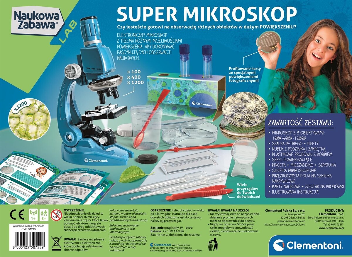 Клементони, Научное развлечение, Супермикроскоп — профессиональный микроскоп , который позволит детям открыть для себя увлекательный мир микромира. Микроскоп увеличивает объекты до 1200 раз, поэтому можно увидеть их структуру и детали, невидимые невооруженным глазом. Простота в использовании