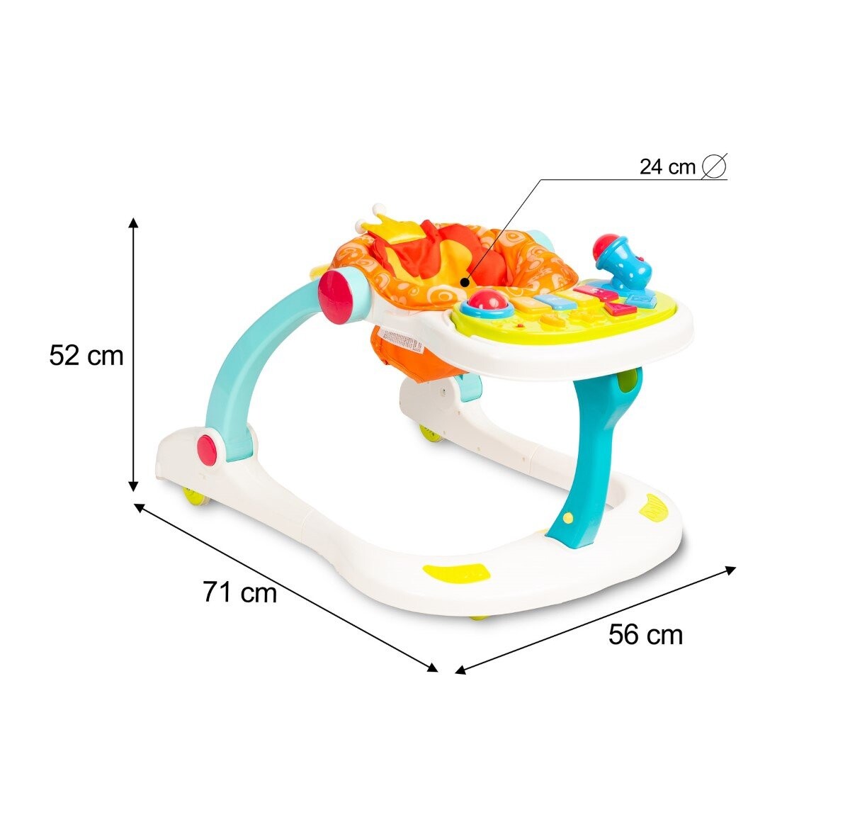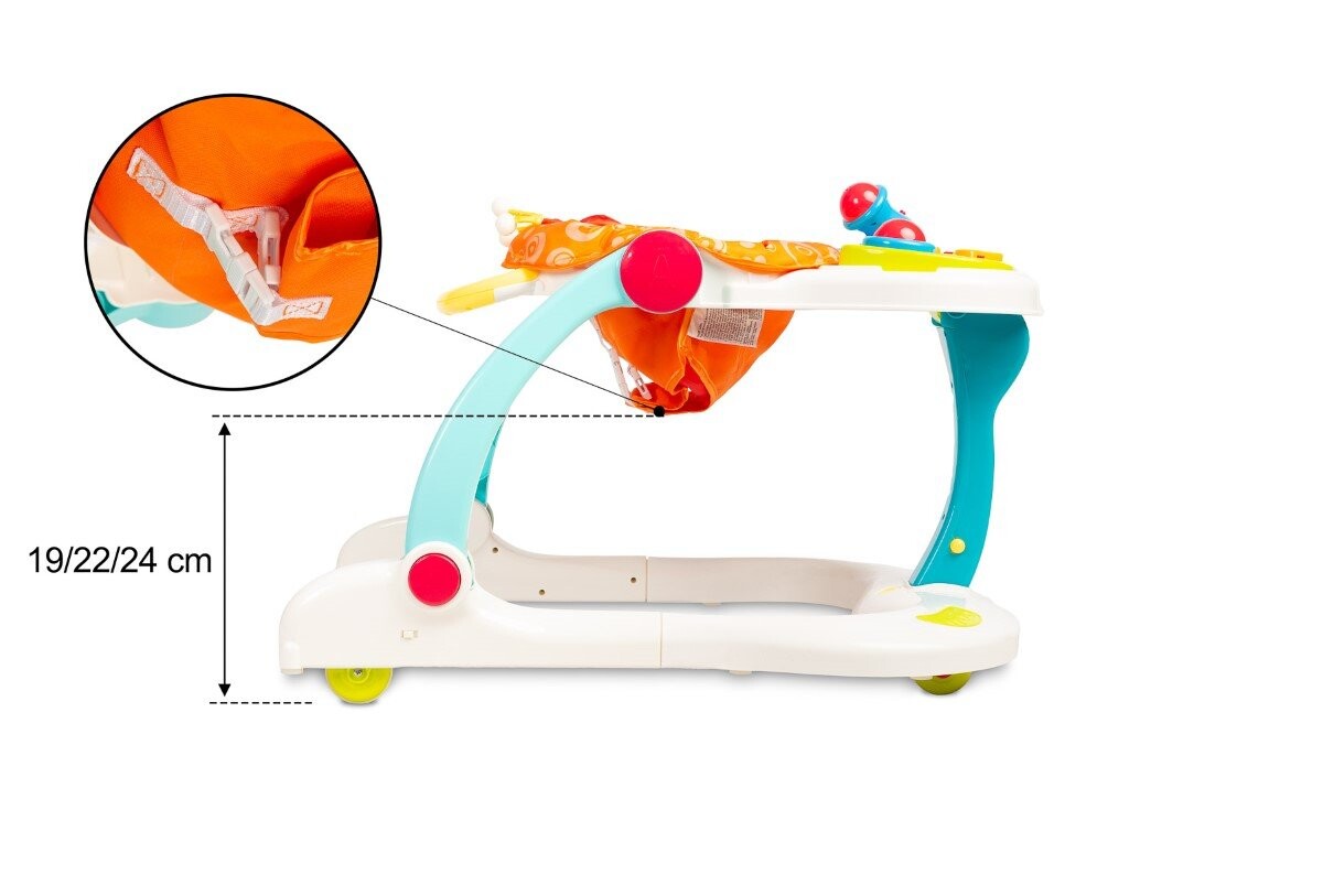 Многофункциональные ходунки от Toyz – универсальное устройство, совмещающее в себе целых четыре функции. Его можно использовать как ходунки, толкачи, низкий стульчик для кормления и игровой центр, где может сидеть ребенок. Ходунки оснащены резиновыми колесами с фиксатором, которые облегчают передвижение и не царапают пол. Высоту сиденья можно регулировать с помощью застежек с пряжкой, адаптируя ее к потребностям ребенка. Контурная ручка, прикрепленная к спине, облегчает удержание и практику ходьбы. В передней части ходунков расположена интерактивная панель, поддерживающая сенсорное развитие. Питается от батареек (3хАА). Он имеет микрофон, красочные светящиеся кнопки, издающие звуки, и двухступенчатый регулятор громкости. Панель легко снимается, открывая поверхность. использовалась для кормления ребенка.
