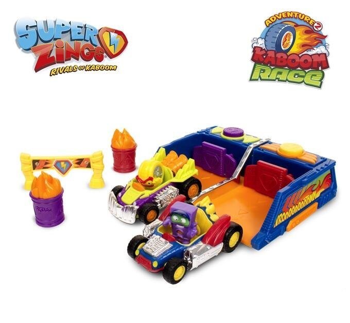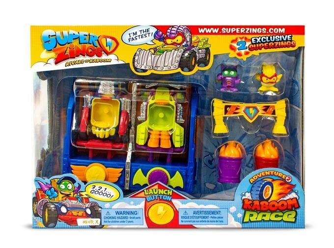 Набор игрушек из мира SuperZings и Kaboom City. В коробке находятся две гоночные машины со стартовой коробкой. Просто нажмите кнопку старта, чтобы начать гонку. Кроме того, спортивную атмосферу усиливают две огненные бочки и специальный барьер, который помогает обозначить маршрут гонки или предупреждает об опасностях, подстерегающих на дороге. В набор также входят две эксклюзивные коллекционные фигурки SuperZings — Рэйлайт и Вилиам — предметы повседневного обихода, трансформированные в фигурки супергероев и суперзлодеев, которые сражаются друг с другом в Кабум-сити. Каждый персонаж обладает особой силой, которая позволяет ему находить и побеждать противников. СуперЗинги используют свои сверхспособности, прячутся в загадочных укрытиях и мчатся по улицам на уникальных автомобилях SuperJets.