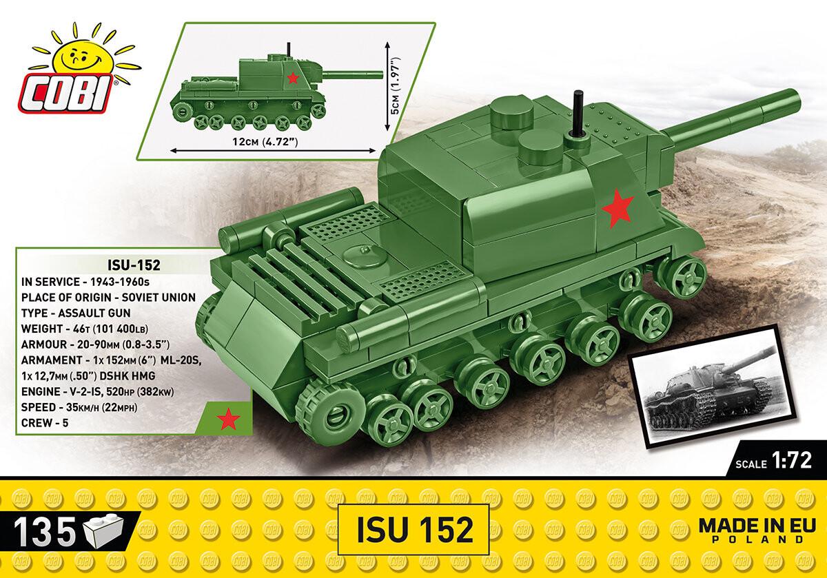 Мини-модель из строительных блоков COBI спроектирована в масштабе 1:72 и состоит из 135 высококачественных элементов. Длина собранного автомобиля составляет 12 см. Несмотря на свои компактные размеры, модель сохраняет все важнейшие черты своего исторического прототипа! На боковых сторонах автомобиля имеется напечатанная маркировка. Модель идеально подходит для хорошего начала вашего приключения со строительными блоками COBI. ИСУ 152 – тоже интересная модель и гаджет для коллекционеров. Он занимает мало места и легко найдет свое место на столе дома, на работе или на книжной полке. Если вы продвинутый конструктор блоков эта модель предоставит вам очень интересные элементы. Выражайте свою страсть с помощью блоков и создавайте историю блок за блоком!