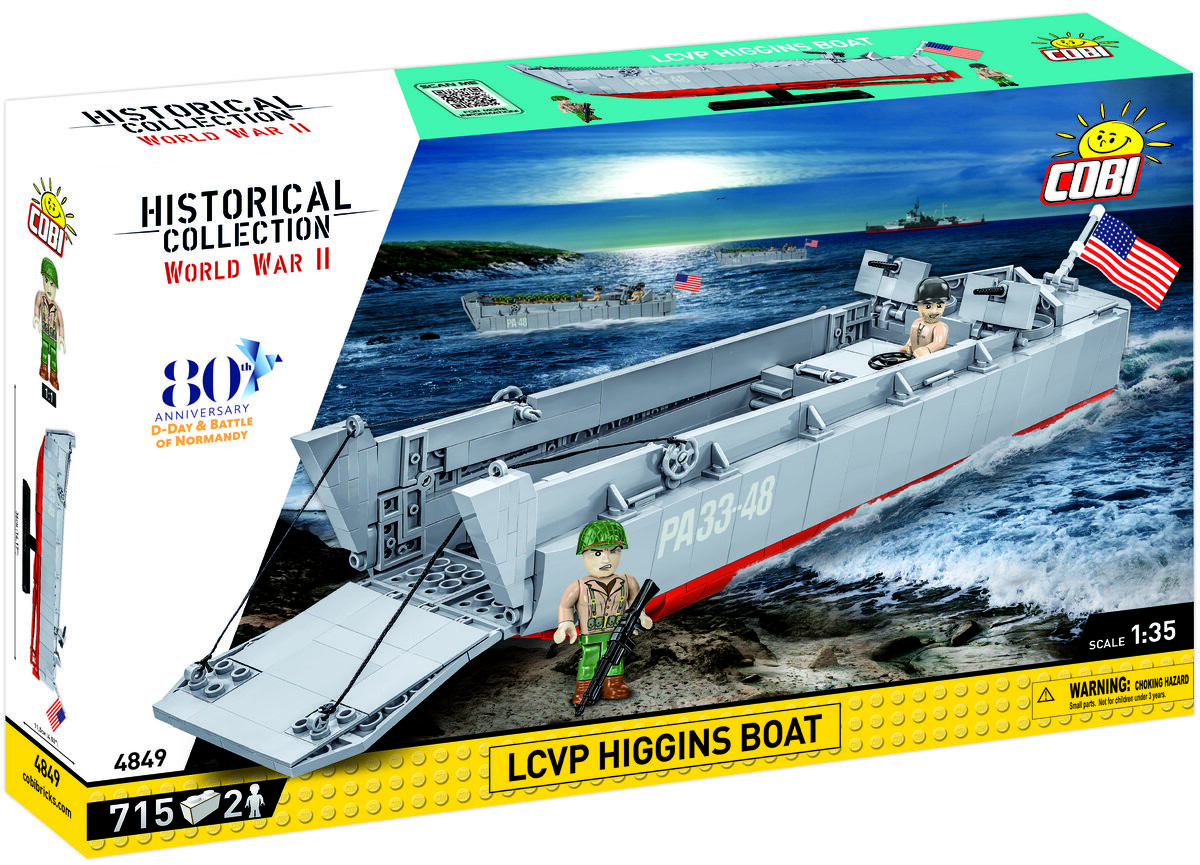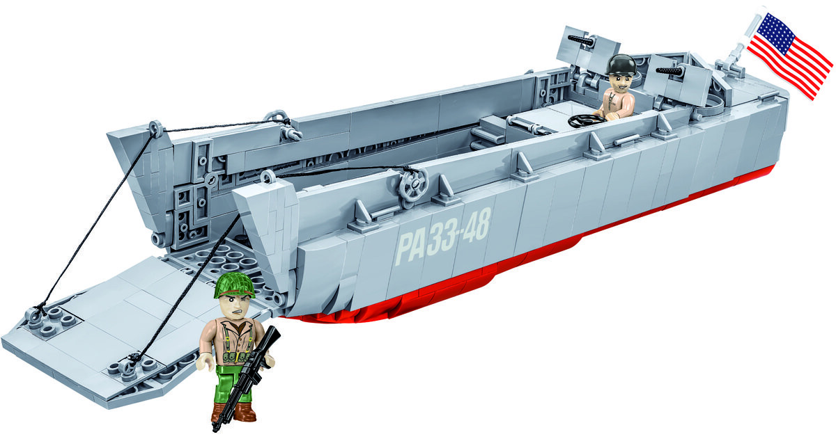 Модель лодки Higgins, изготовленная из строительных блоков COBI, точно отражает свой исторический прототип, сохраняя популярный масштаб 1:35. Блок-баржа — это совершенно новая конструкция, спроектированная с нуля. Длина модели 36 см. Он имеет открывающуюся рампу и детализированный полный корпус. В комплект входят такие подвижные элементы, как два пулемета с крышками и механизм опускания и подъема передней аппарели на основе тросовой системы. Мы не забыли о таких деталях, как руль направления. турбины и открывающийся люк с очертаниями двигателя внизу. В наборе есть стойкие принты! Для демонстрации этой прекрасной модели мы спроектировали специальный кирпичный стенд с табличкой с названием лодки. В набор также входят две фигурки, изображающие американского пехотинца и матроса из команды баржи. На барже развевается большой флаг США, напечатанный с обеих сторон.
