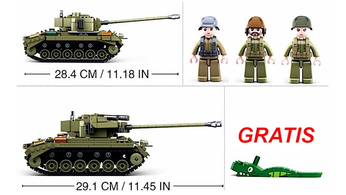 Длина танка М26 «Першинг» в собранном виде по инструкции: 28,4см. Длина танка Т26Е4-1 Супер Першинг в собранном виде по инструкции: 29,1 см. Мы получаем в подарок разделитель блоков в форме крокодила. Блоки изготовлены из высококачественных материалов, вся продукция сертифицирована CE, ROHS и ISO.