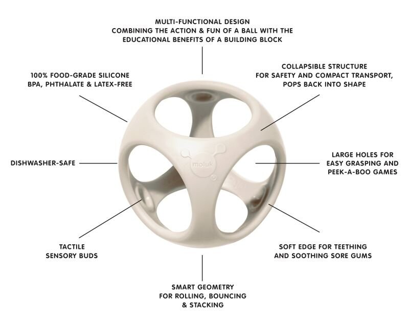 Игрушка Ойбо представляет собой комбинацию мяча и кубика — она сочетает в себе игру с мячом и расстановку кубиков. Как и все игрушки Молук, Ойбо растет вместе с вашим ребенком. Для малышей он отлично подходит как мягкий прорезыватель для зубов. легко поймать. Позже его будут использовать для катания и подпрыгивания. Детям постарше понравится использовать Ойбо, чтобы бросать или строить башни. Игрушка возвращается в исходную форму после каждого раздавливания или стояния. Располагая и выравнивая элементы, ребенок изучает геометрию, тренируя зрительно-моторную координацию и мелкую моторику. Ойбо полностью совместим со всеми игрушками Молук.