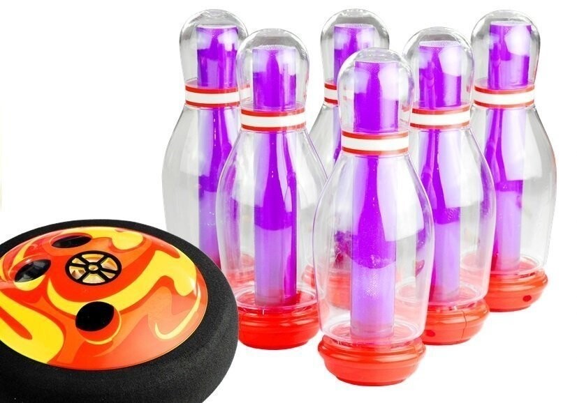 Как играть в боулинг? Нет ничего проще. Положите набор кеглей для боулинга рядом на плоскую гладкую поверхность — и вы готовы начать веселиться! Летающий диск необходимо осторожно толкать, чтобы он мог свободно скользить по направлению к сбиваемой цели. Выигрывает тот игрок, который сбьет наибольшее количество кеглей. Главное, стоит подчеркнуть принципы работы диска. В его нижней части расположен вентилятор, создающий сильную струю воздуха, заставляющую игрушку парить над полом. Это инновационное решение влияет на безопасность и полностью снижает проблему мягкой мебели или пола.