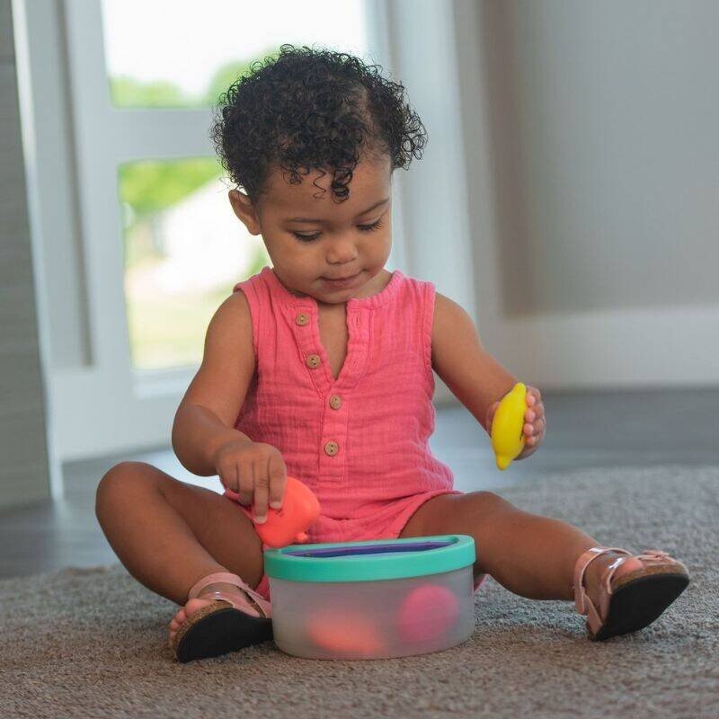 Сортировщик для малышей и маленьких детей в виде стаканчика с 6 разноцветными фруктами. Задача детей – протиснуть фигуры через крышку с помощью ниточек. Игра с сортером Sassy – это возможность для самых маленьких потренировать мелкую моторику, выучить названия цветов, фруктов, приобрести новые навыки счета. Плоды мягкие и приятныена ощупь, поэтому их можно смело кусать и сжимать.