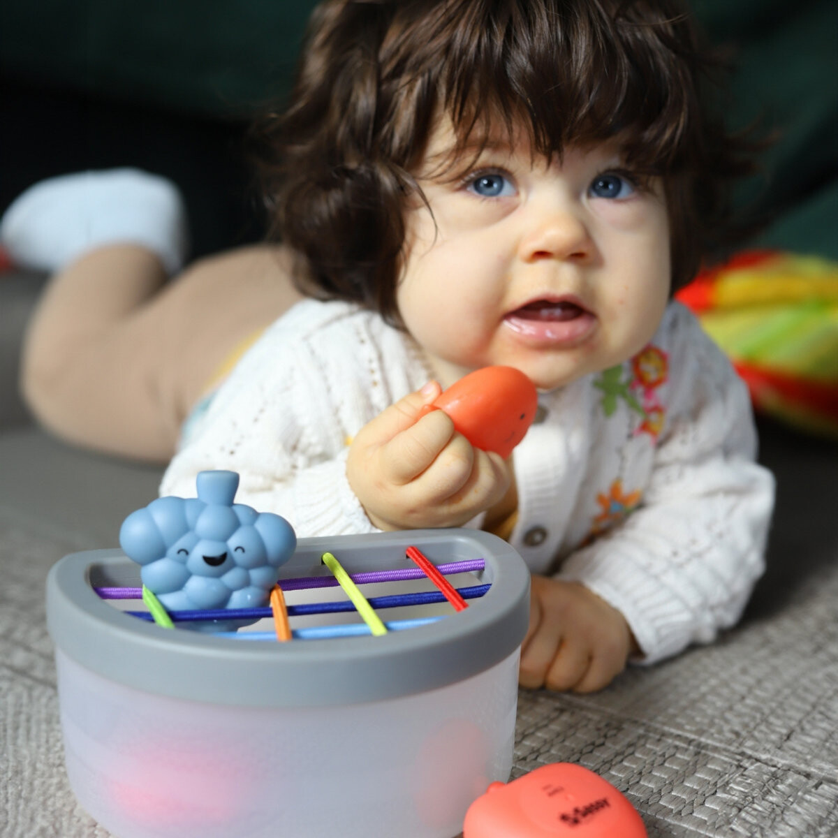• Продавливание крышки с помощью веревочек улучшает моторику ребенка.