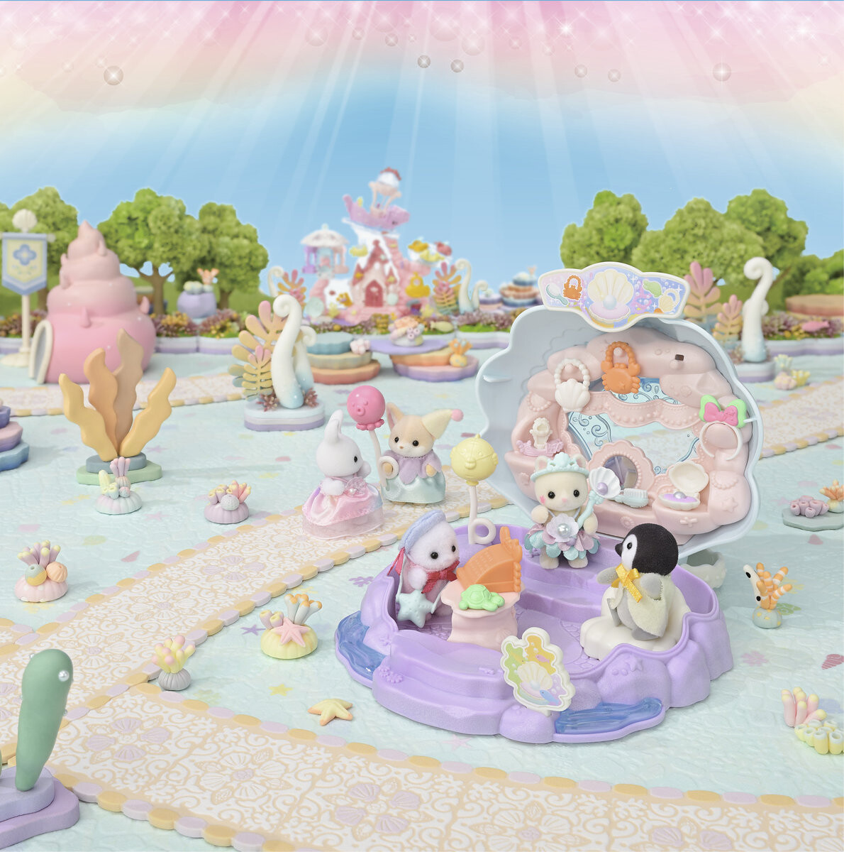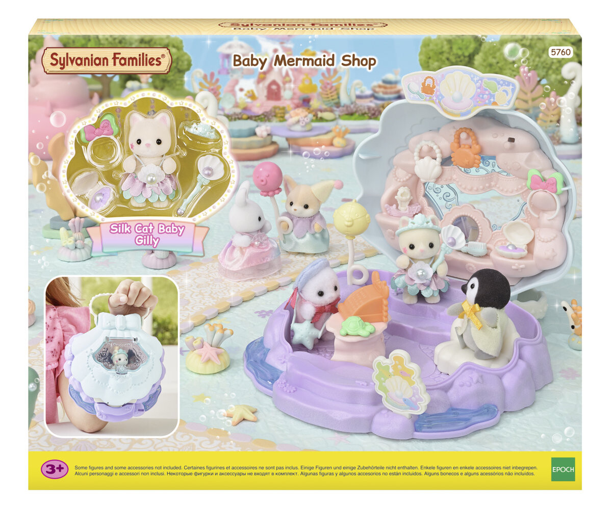 В набор «Русалочка Лавочка» входит лавка в форме ракушки, аксессуары с элементами океана и шелковая фигурка котенка. Аксессуары, продаваемые в магазине, подходят к детским фигуркам Sylvanian Families. Когда магазин закрыт, он превращается в удобный ящик-ракушку для перевозки игрушек! Откройте ракушку и поприветствуйте первых покупателей в магазине русалок. Когда вы закончите играть, вы можете закрыть магазин, закрыв раскладушку. Фигурки и аксессуары можно спрятать в ракушку, которая превращается в коробку с ручкой для транспортировки. Малышка из семейства шелковых котят одета в костюм принцессы-русалки. Фигурка может носить аксессуары и держать воздушные шары. Фигурки и аксессуары из набора можно комбинировать с другими наборами. Дома и аксессуары Sylvanian Families. Игрушки Sylvanian Family производятся японской компанией Epoch уже более 35 лет. Их отличает исключительное качество и внимание к деталям. У фигурок подвижные головы, руки и ноги. Рекомендуется для детей от 3 лет и старше.
