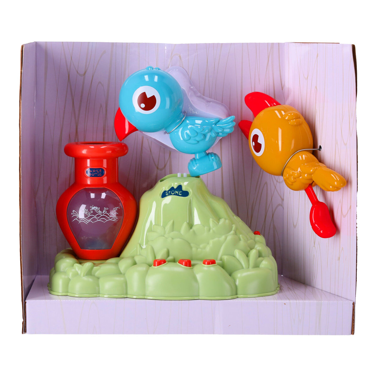 Кроме того, в игрушке присутствует птичка-мама, которая приносит камешки своему малышу. Малыш может попрактиковаться в ручном труде, положив эти камешки в кувшин. Чтобы убрать камни из игрушки, просто воспользуйтесь окном сзади.