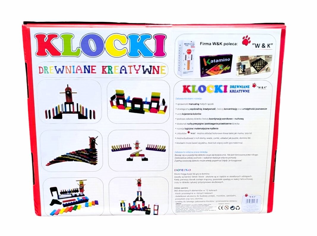 Игра с кубиками развивает: ловкость рук, стратегическое воображение, творческие способности, тренирует концентрацию и познавательные способности, учит цветовым ассоциациям во время игры, тренирует зрительно-моторную координацию, улучшает точность движений и пространственное восприятие ребенка, развивает логическое и математическое мышление. Подумав, блоки W&K можно использовать для формирования красочных слов, таких как мама, папа и т. д. Вы можете использовать их, чтобы строить дома, башни, замки, расставлять их, как головоломки, домино и т. д. С ними могут играть один, два или несколько человек. кубики (семейная игра)