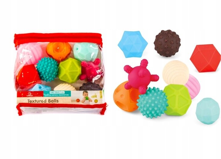 В набор входят 10 сенсорных мячей . Это простая игрушка, универсальная: с ней можно играть, как с обычным мячом. , как сенсорная игрушка благодаря выступам или как игрушка для ванны.