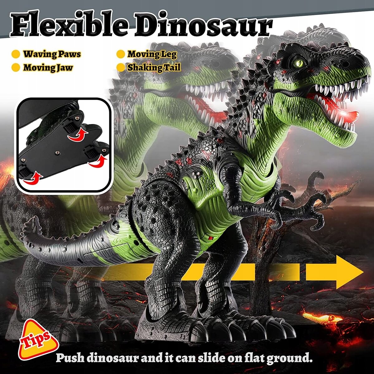 Динозавр может идти вперед самостоятельно, покачивая головой и хвостом. Гибкие конечности и колеса под ногами.