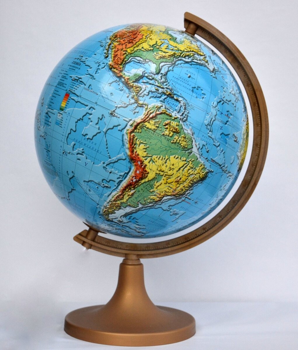 Откройте для себя мир с помощью глобуса! Глобус — это трехмерное изображение нашей планеты, реалистично передающее ее форму и пропорции. Глобус имеет сферическую форму, на которой расположена карта Земли, отражающая характерные особенности каждого из ее регионов. Его часто используют в качестве исследовательского пособия для изучения географии, изучения мира и понимания взаимосвязей между различными частями мира. Как глобус поможет вам углубить географические знания? 3D-визуализация: На глобусе Земля изображена как сферическая сфера, что позволяет лучше понять пространственные взаимоотношения между континентами, океанами и другими географическими объектами. функции. Облегчает поиск: Глобус позволяет нам легче находить и идентифицировать различные географические области. Мы можем отслеживать местоположение стран, городов, рек, горных хребтов и других географических объектов. что помогает нам развивать навыки ориентации. Понимание климатических зон. На глобусе показаны различные климатические зоны на Земле, такие как экваториальная, тропическая и полярная зоны. Мы можем увидеть и понять, как эти зоны распределены по земному шару и как они влияют на климат, растительность и животных. Изучение континентов и океанов: Глобус позволяет изучать континенты и океаны, их расположение, размеры и взаимоотношения. Знание границ стран Глобус — полезный инструмент для изучения границ стран и понимания культурных различий. Зачем, 3D-физический глобус