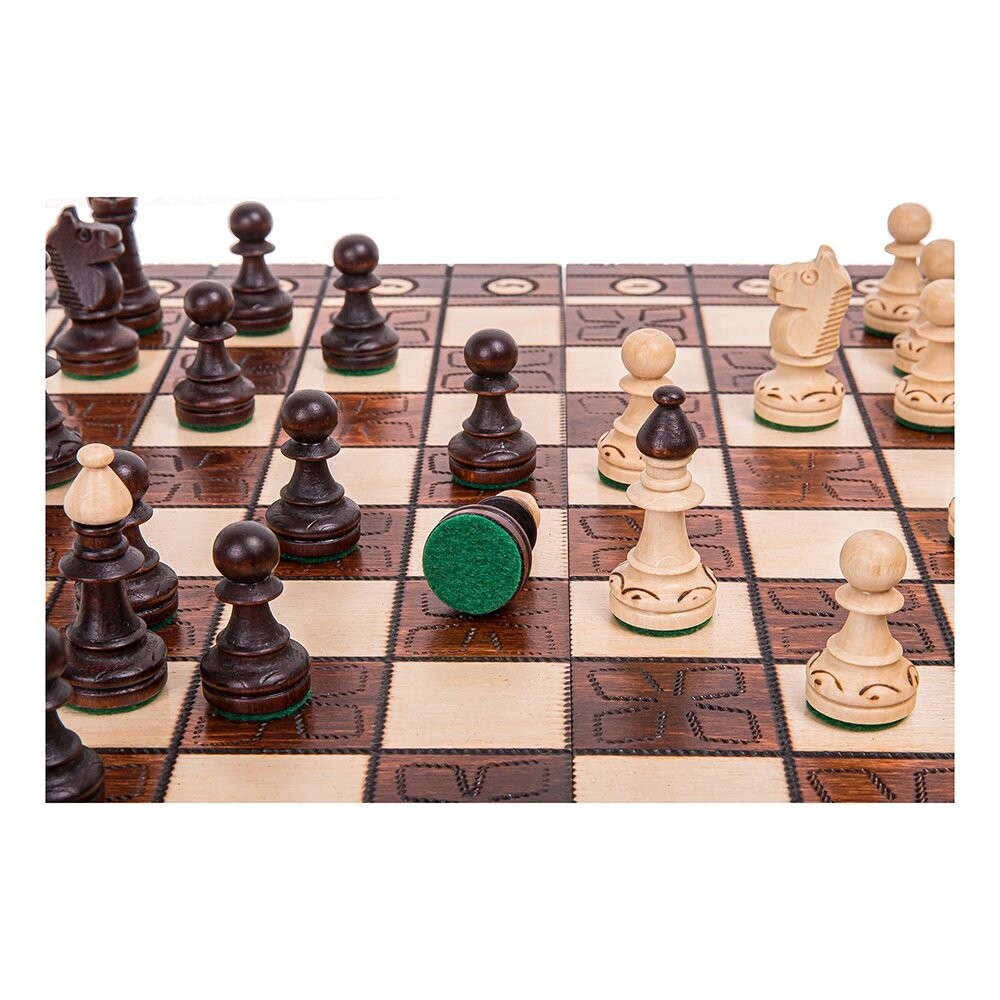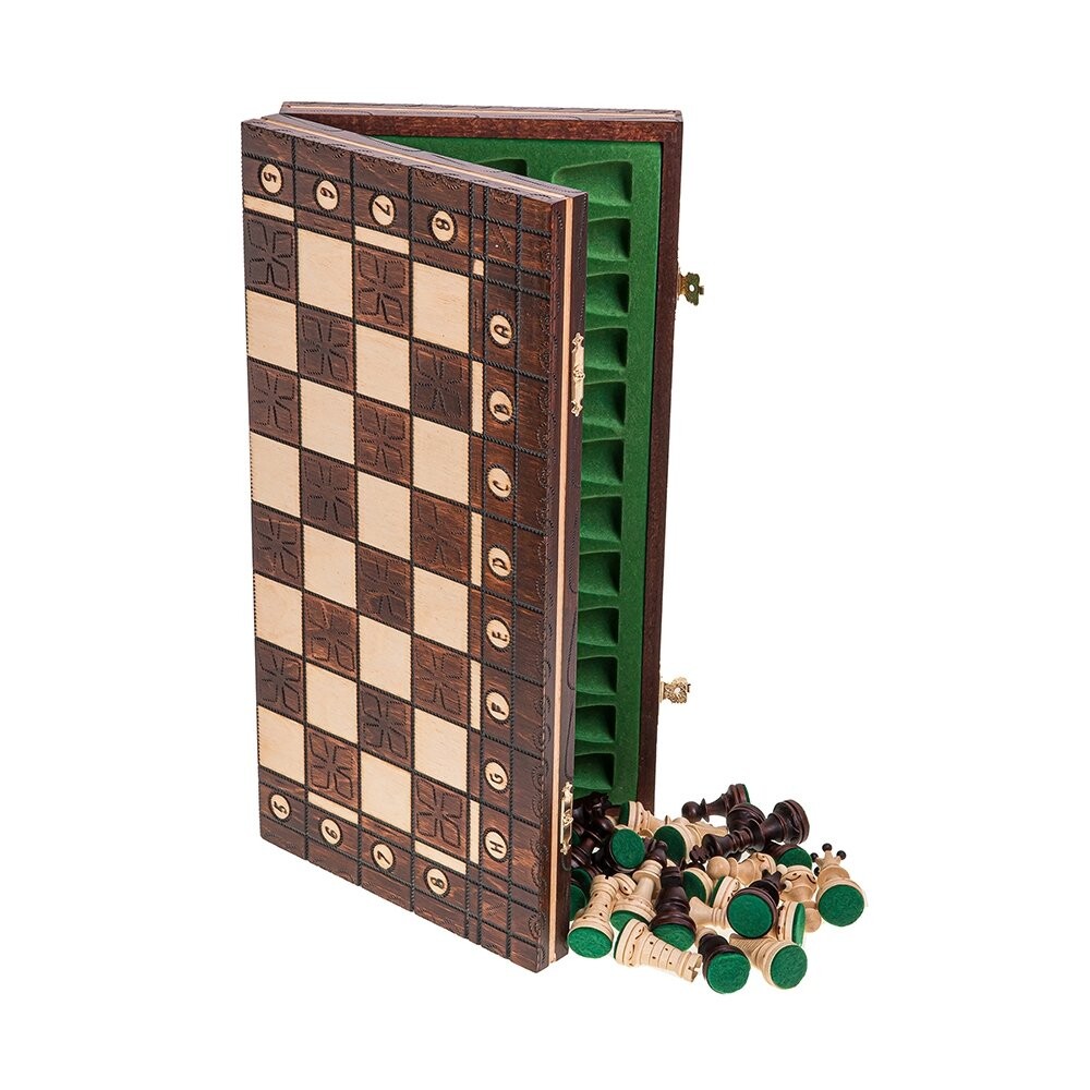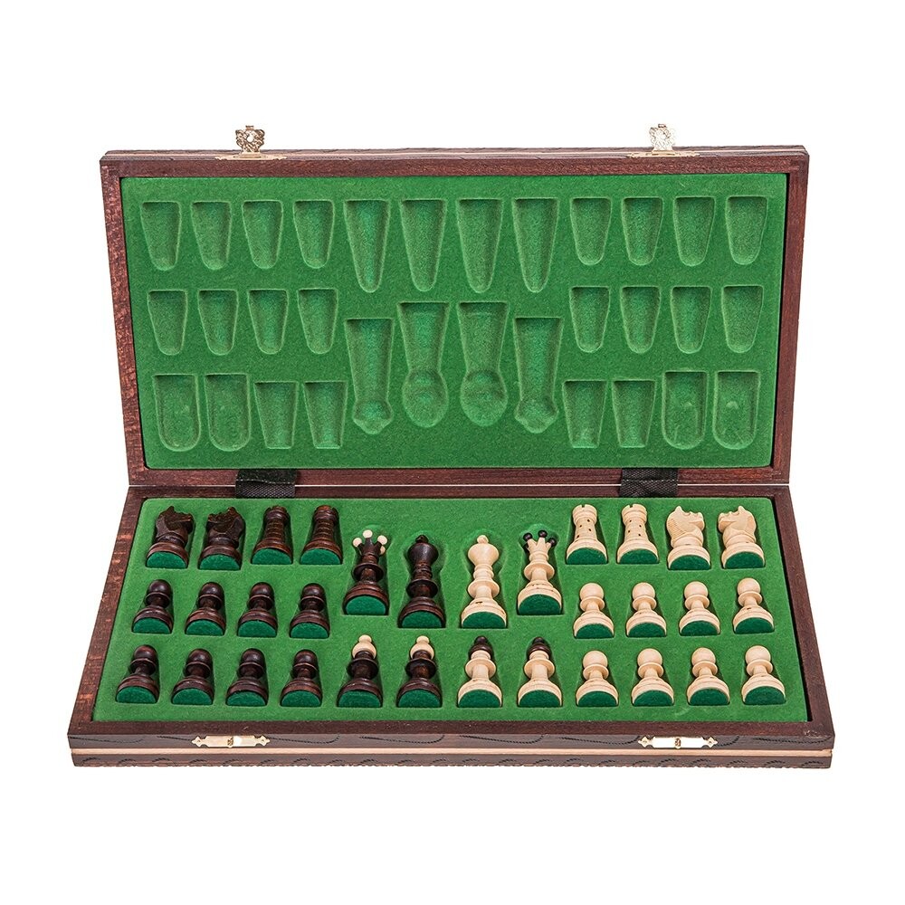 Шахматы JUNIOR AGШахматная доска изготовлена ​​вручную из древесины бука/березы. Окрашена полуглянцевая, внутри заполнена элегантной вставкой.Размеры кассеты: 410 х 410 ммВ сложенном виде 410 х 205 х 53 ммФигурки выточены из граба, покрыты лаком, обклеены фетром.Высота фигурок: пешка 38 мм - король 72 мм