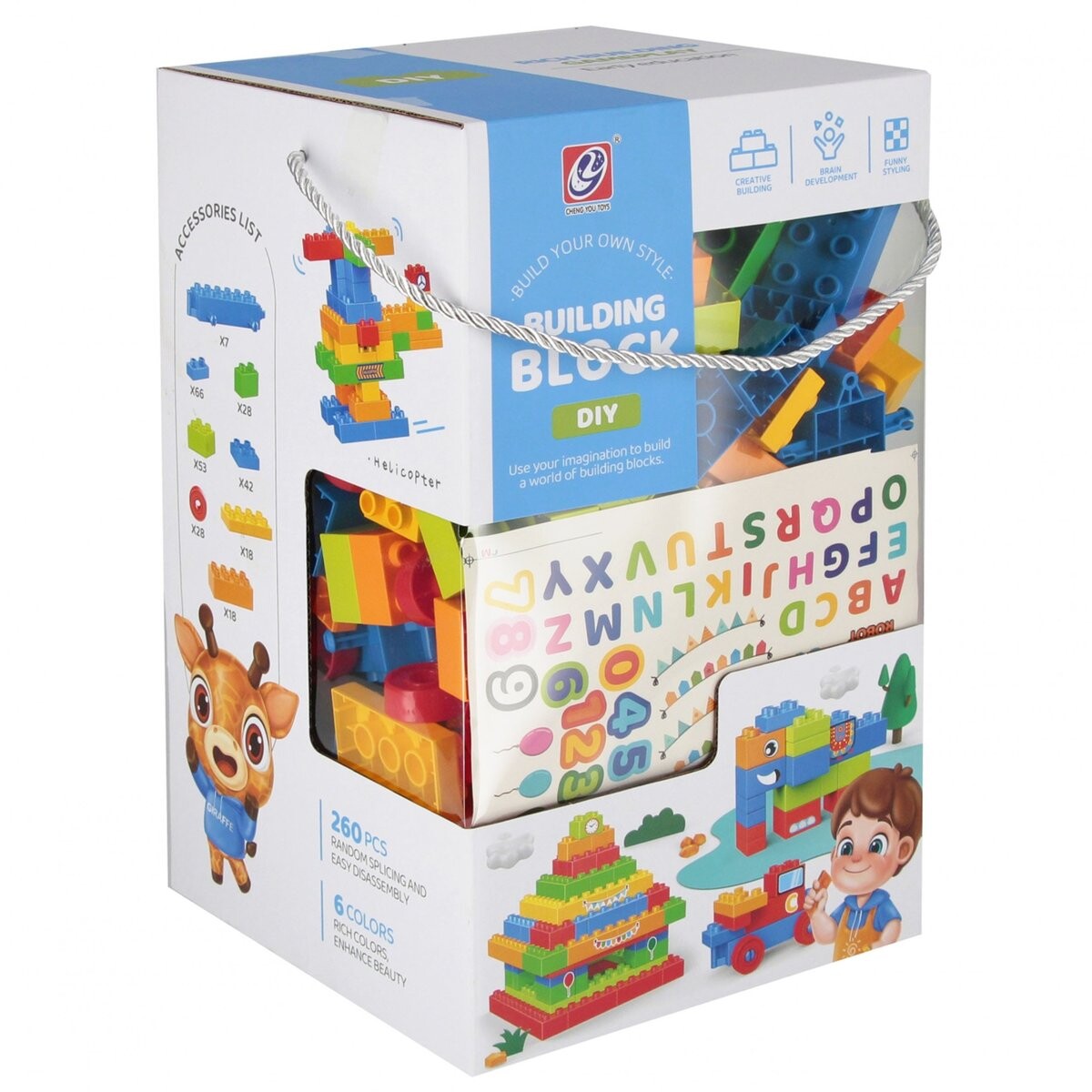 Содержимое набора:260 разноцветных строительных блоков и наклейки