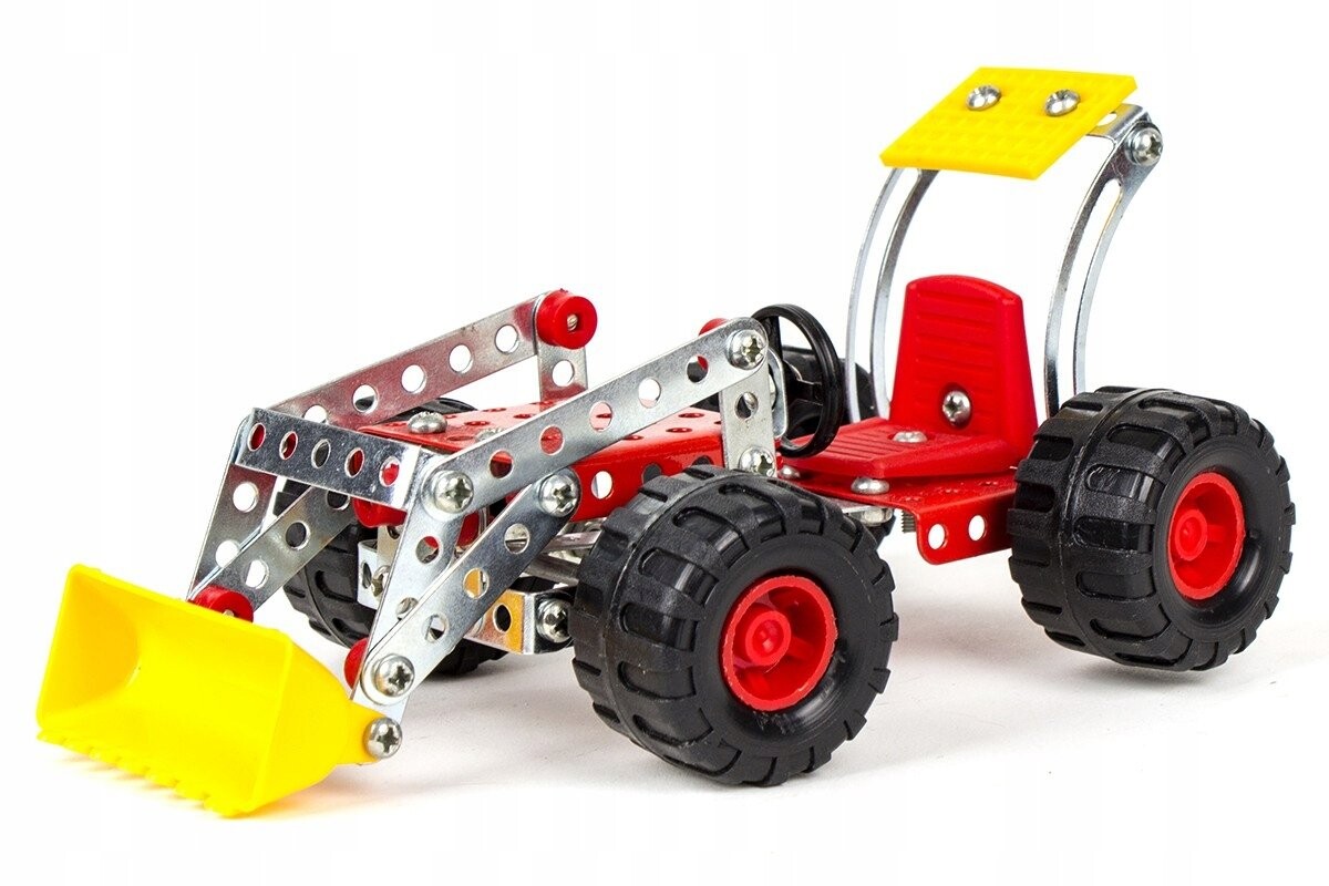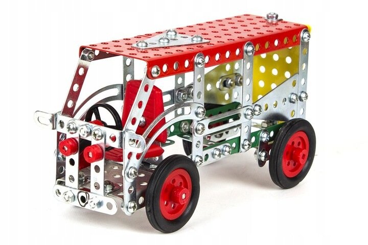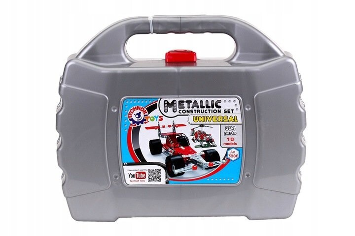 Конструкторы, металлические транспортные средства, 10 в 1, 304 детали Благодаря игрушке мальчики и девочки осваивают первые навыки соединения деталей с помощью шурупов, гаек, работы с отверткой и гаечными ключами. Своими руками они создают настоящие «работающие» модели: различные автомобили, вертолет, кран, трактор, поезд, внедорожник, танк, мотоцикл и многие другие. Работа с игрушкой вызывает у детей интерес к работе машин и механизмов и дает им основные представления о взаимодействии отдельных частей. Знакомит с техническими названиями деталей, простыми чертежами и схемами. Игра развивает лучше логическое мышление, пространственное воображение, внимательность и фантазию. Из металлических конструкций можно собрать модель молекулы, цветка, ветряной мельницы или динозавра. Металлический конструктор ТехноК отличается высоким качеством и разнообразием деталей. интересное сочетание металлических и пластиковых деталей. В каждый набор входят отвертки и ключи для сборки модели. В помощь юным механикам – красочная подробная пошаговая инструкция, которую можно скачать на сайте нашей компании. Конструктор «ТехноК Стройплощадь» — это металлический конструктор нового поколения. Из элементов набора можно собрать 7 моделей: грузовик, грейдер, лестницу, трактор с прицепом, тачку и кран. Конструктор упакован в серебристый металлопластиковый кейс с замком. Чемодан также является удобным контейнером для хранения вещей и инструментов. Игрушка предназначена для детей от 5 лет.