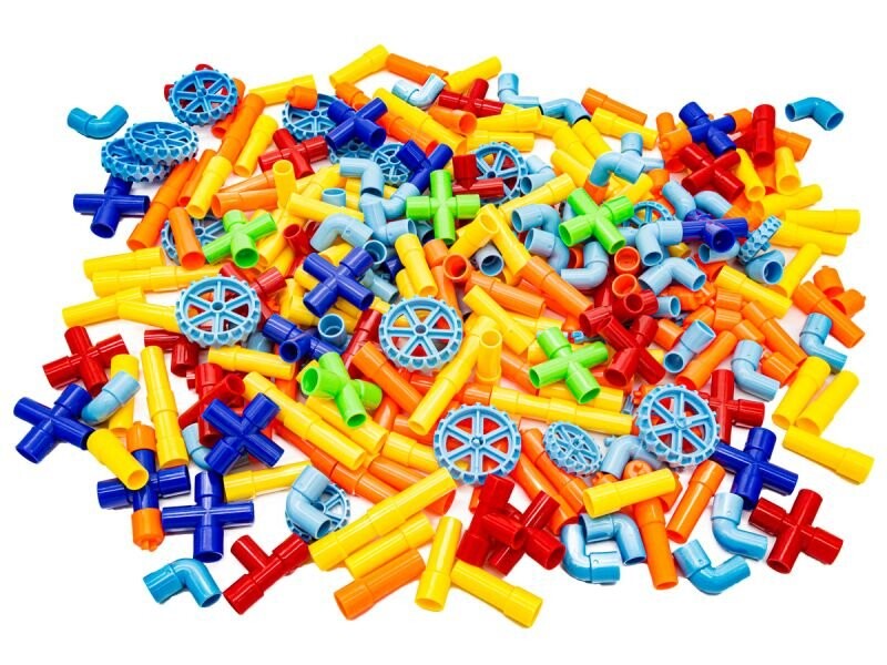 Этот набор состоит из более чем 340 элементов , таких как разноцветные пластиковые трубы, колена и множество других аксессуаров, позволяющих построить любую конструкцию.