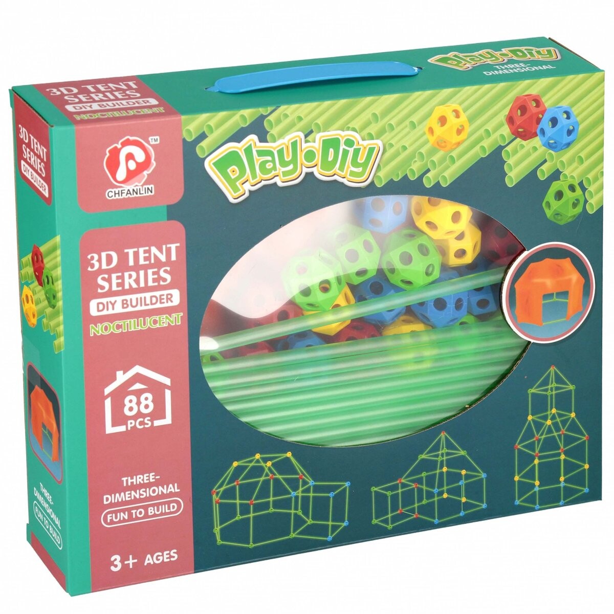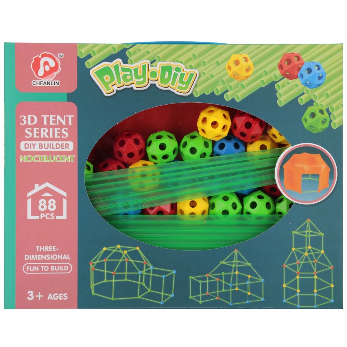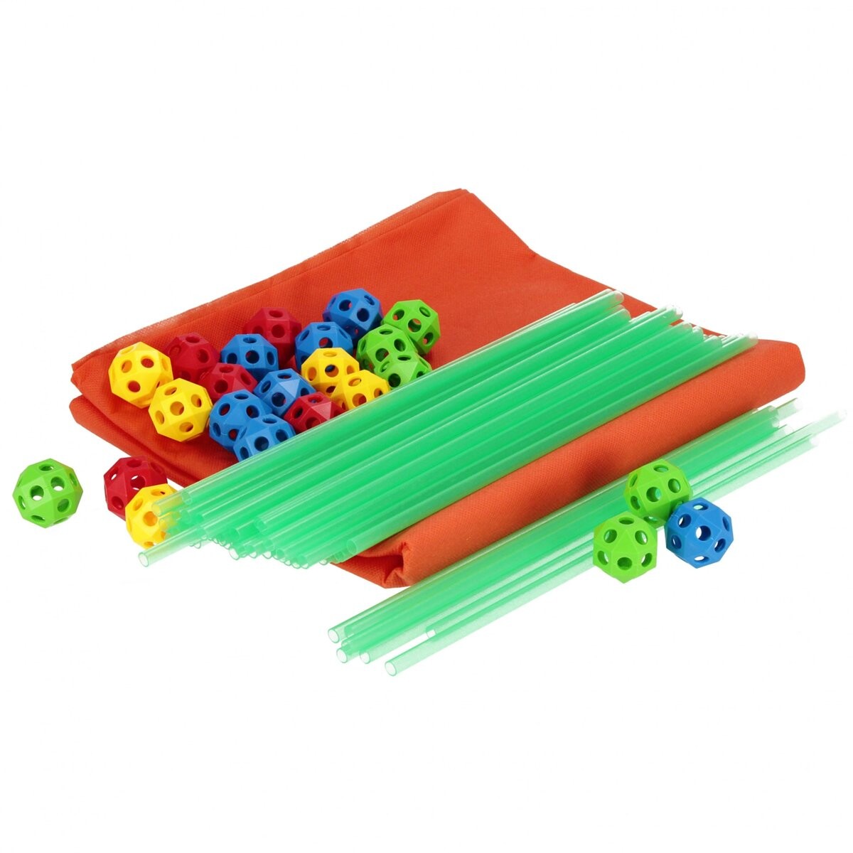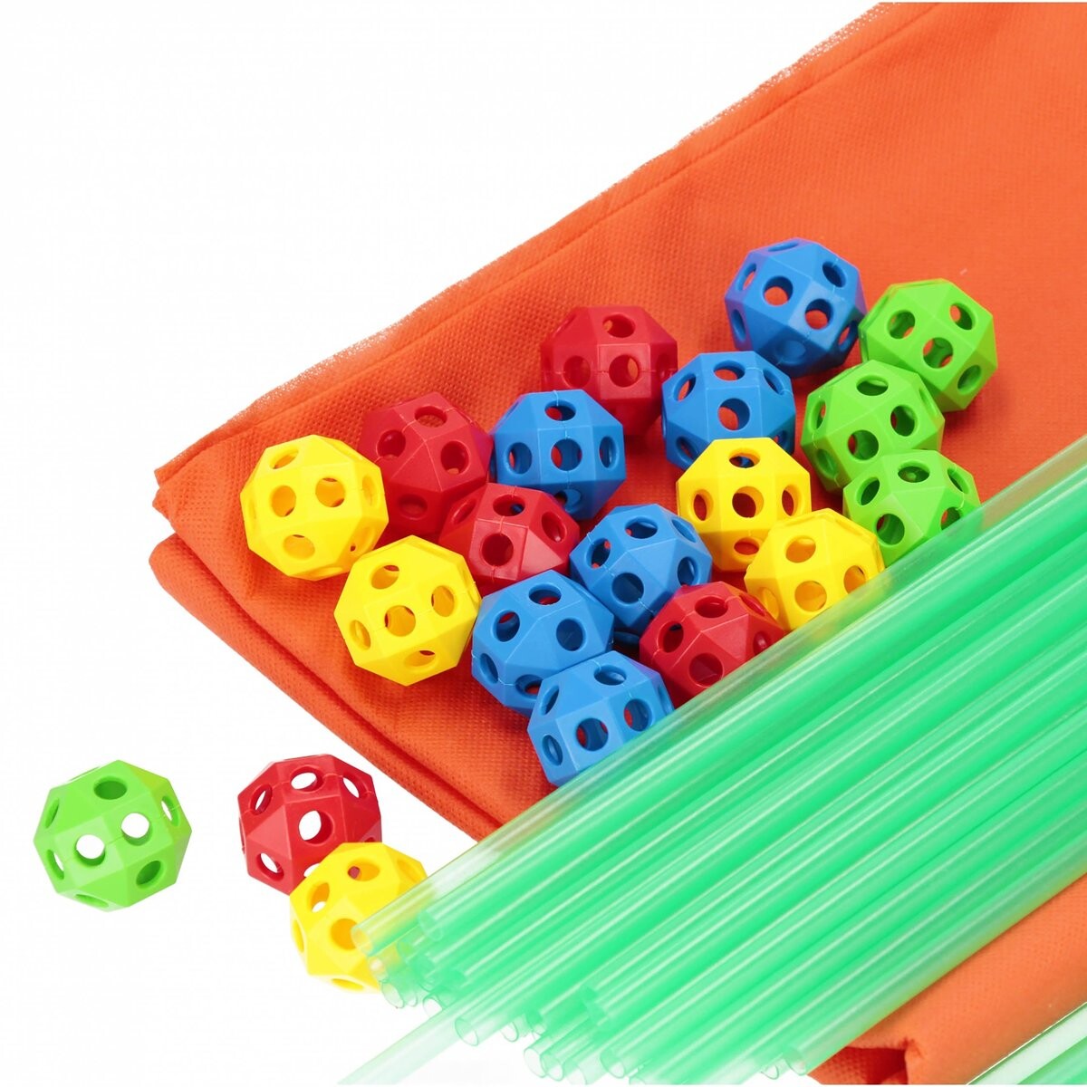 Набор содержит 88 элементов, в том числе разноцветные шарики и соломинки, которые можно комбинировать для создания фантастических геометрических фигур.