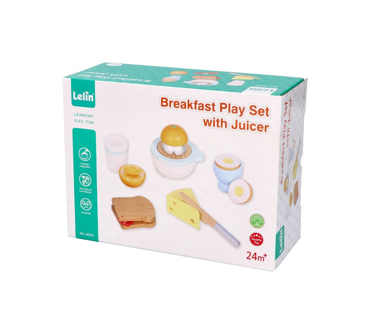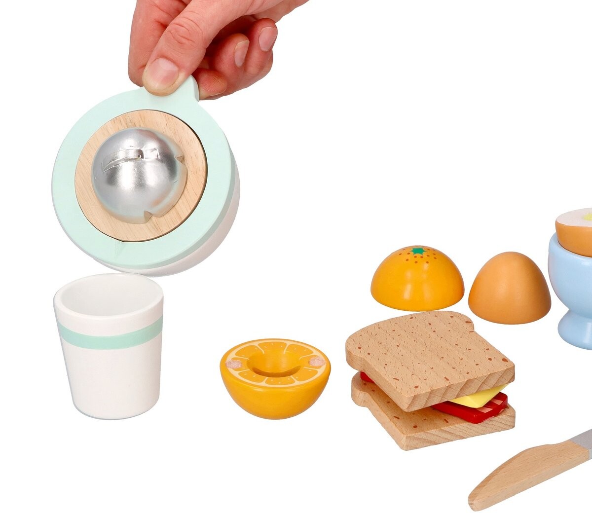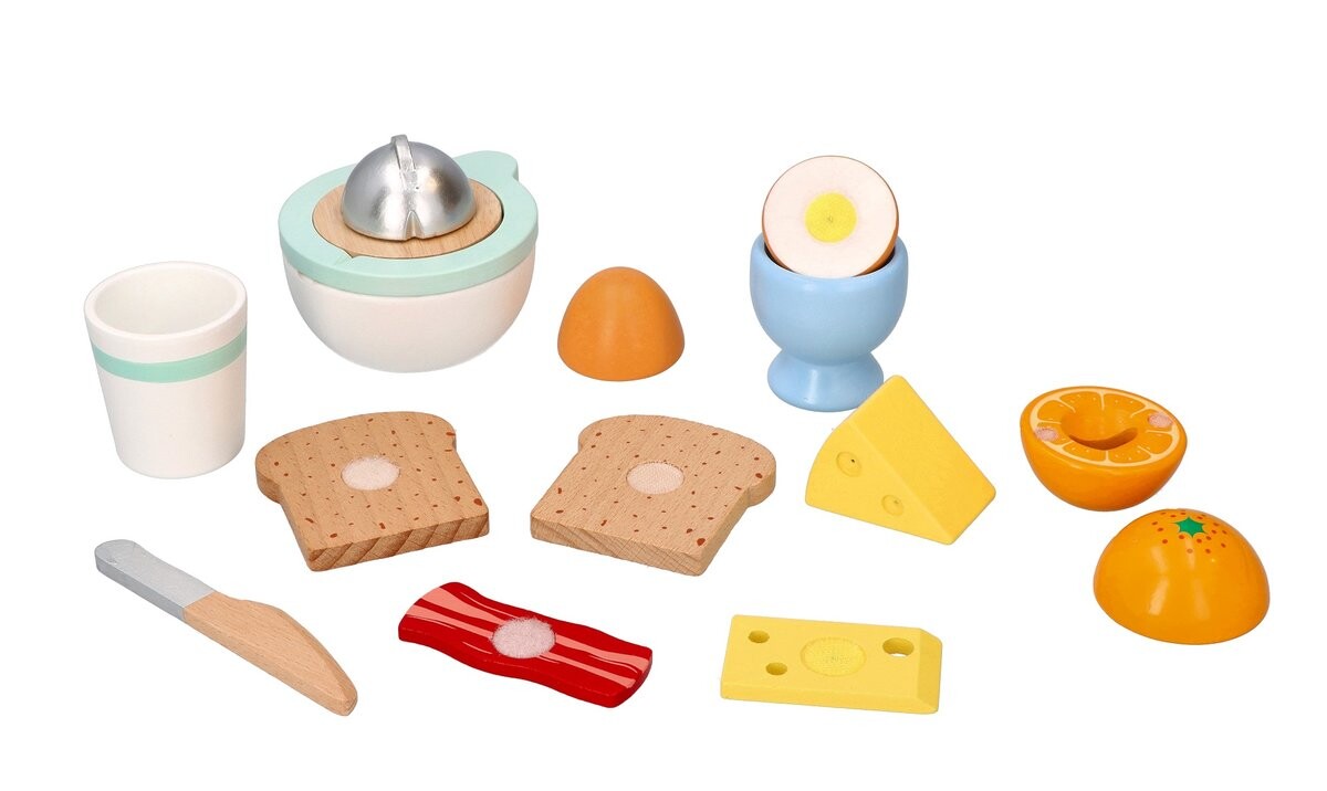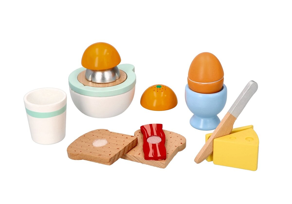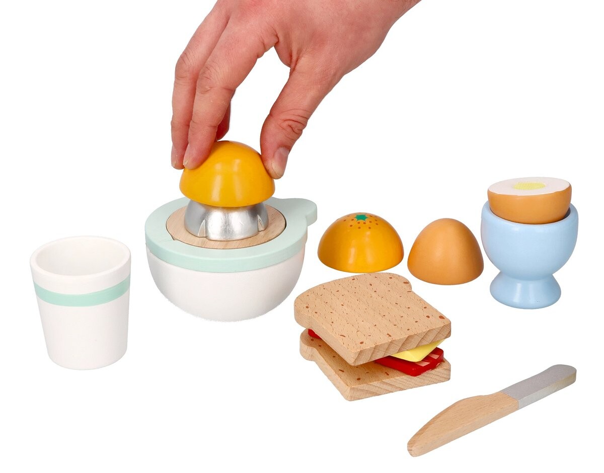 В наборе 10 элементов: *соковыжималка для фруктов (при «сжимании» издает реалистичный звук) *2 половинки апельсина, *чашка, *2 половинки яйца на липучке, *подставка для яиц, *2 кусочка сыра, *2 ломтика хлеба, *ломтик бекон, *нож.