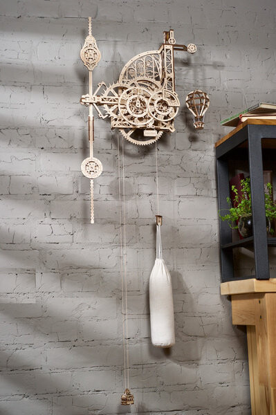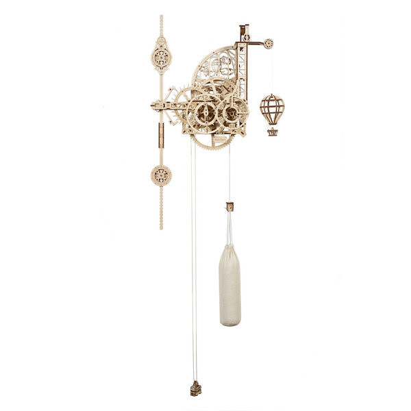 приводится в действие силой тяжести, тянущей вниз утяжеленный мешок (его можно наполнить песком или солью). Поднимите сумку на шкивах, чтобы завести часы. По мере того, как груз медленно падает, ведущее колесо вращается, которое затем поворачивает спусковое колесо через редуктор. Он имеет регулируемый маятник с грузами, который взаимодействует со спусковым колесом посредством регулярного тикания спускового механизма. Тикание часов можно регулировать с точностью до секунды, перемещая верхний и нижний маятниковые грузы. Редуктор также передает вращение на часовой и минутный циферблаты. Время не читается вращающимися стрелками на циферблате. но неподвижная стрелка указывает время на медленно вращающихся пронумерованных циферблатах (часы и минуты). Эти циферблаты вращаются против часовой стрелки. В роли «кукушки» выступает модель воздушного шара. Подвешенный воздушный шар быстро опускается, когда пробьет час, а затем снова медленно поднимается в течение следующего часа. Как настроить часы? - Посмотреть фильм . Дополнительная информация о деревянных часах Aero Clock: 3D деревянная механическая модель, рабочий таймер, основная тема модели: раннее воздухоплавание, корпус и деревянный часовой механизм изображают авиабазу, расположенную среди облаков, стиль стимпанк , складывается без использования клея, материал: фанера, цвет: натуральный Размеры модели: 75x47x16,5 см, максимум 220x47x16,5 см, уровень: продвинутый, в упаковке 320 деталей, время сборки: 10-12 часов, высота подвески и время работы:Доставка товаров осуществляется курьером или на пункт выдачи заказов.
