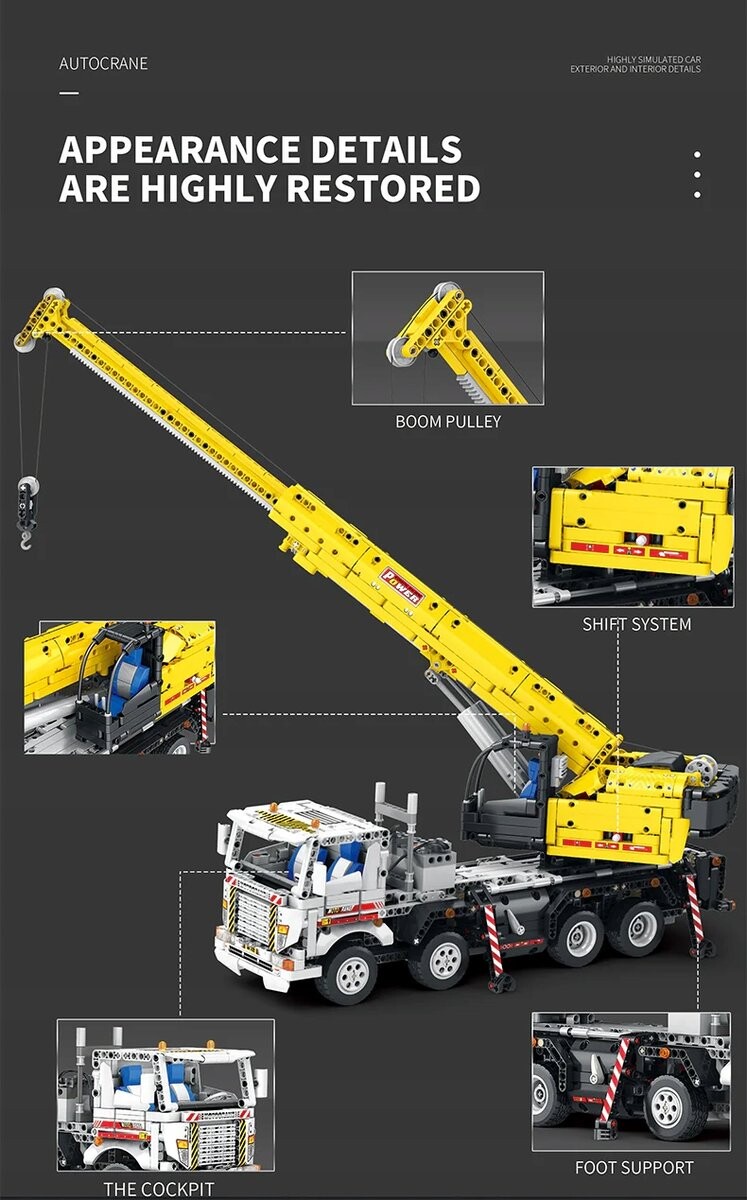 Ты нужен своей команде создайте свой собственный Автокран . Блоки легко соединяются, поэтому сборка крана превращается в настоящее удовольствие. Прочная конструкция модели обеспечивает долговечность, а компактный размер позволяет брать ее куда угодно. Благодаря тщательному проектированию каждый кубик в этом наборе способствует передаче деталей, которые делают модель уникальной и реалистичной.