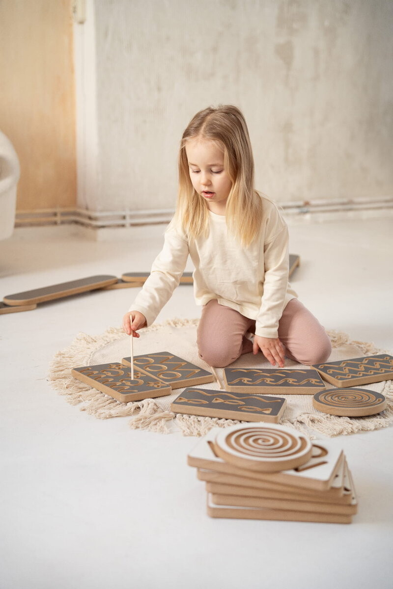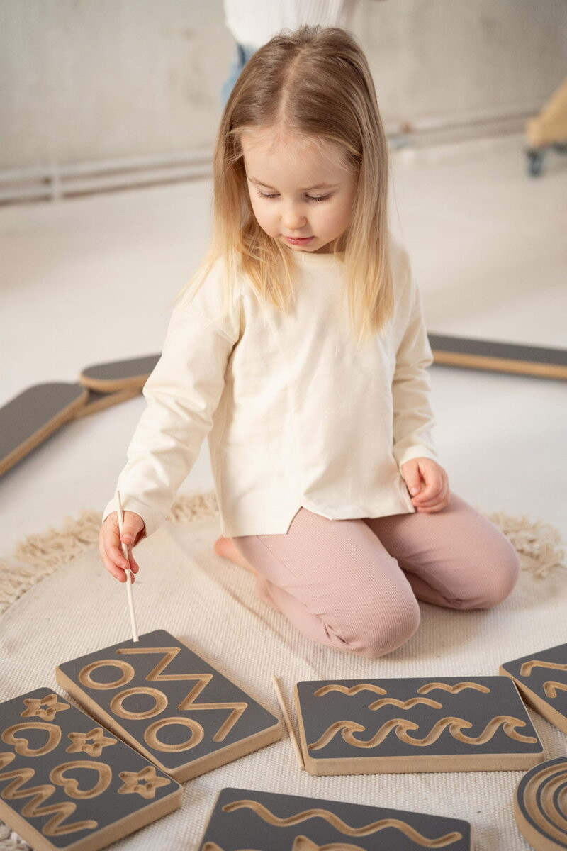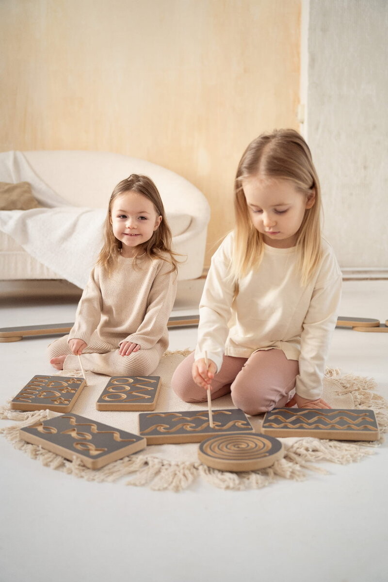 Как пользоваться досками? В комплект входят две палочки, которыми можно следовать по созданным нами следам. Однако расставлять зерна – фасоль, кофе или нут – в ряды веселее. Отличная идея для игры с листом бумаги: его можно порвать на мелкие кусочки, слепить из них шарики и разложить их – часы веселья и развития гарантированы! На обратной стороне доски мы сделали логотип tuptiwood.