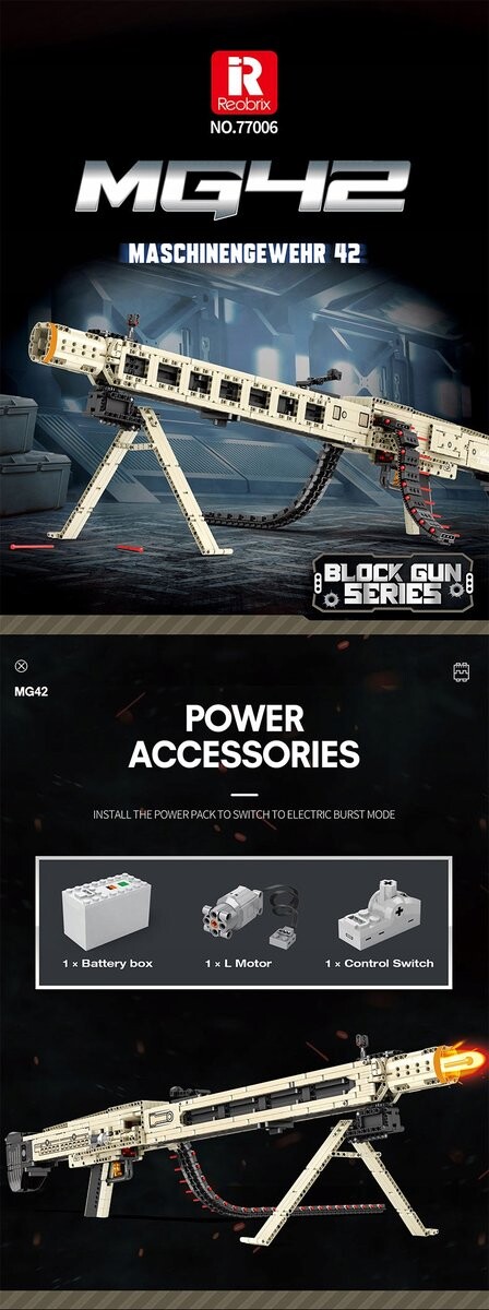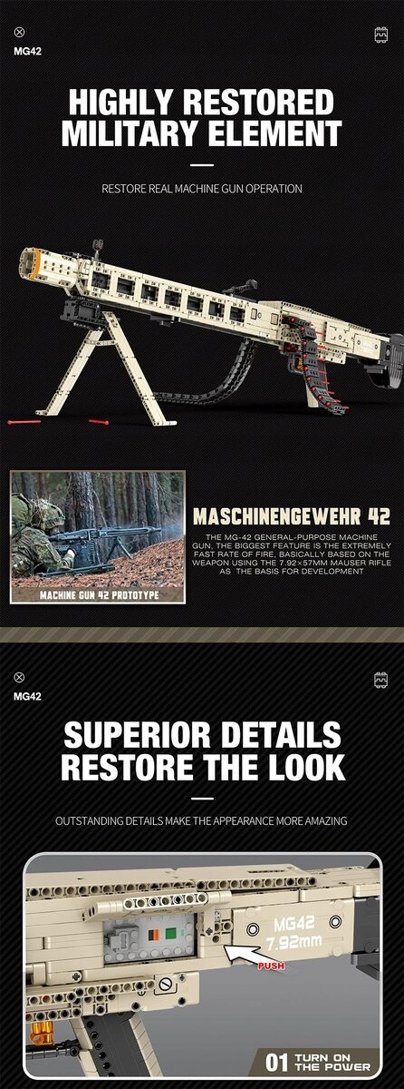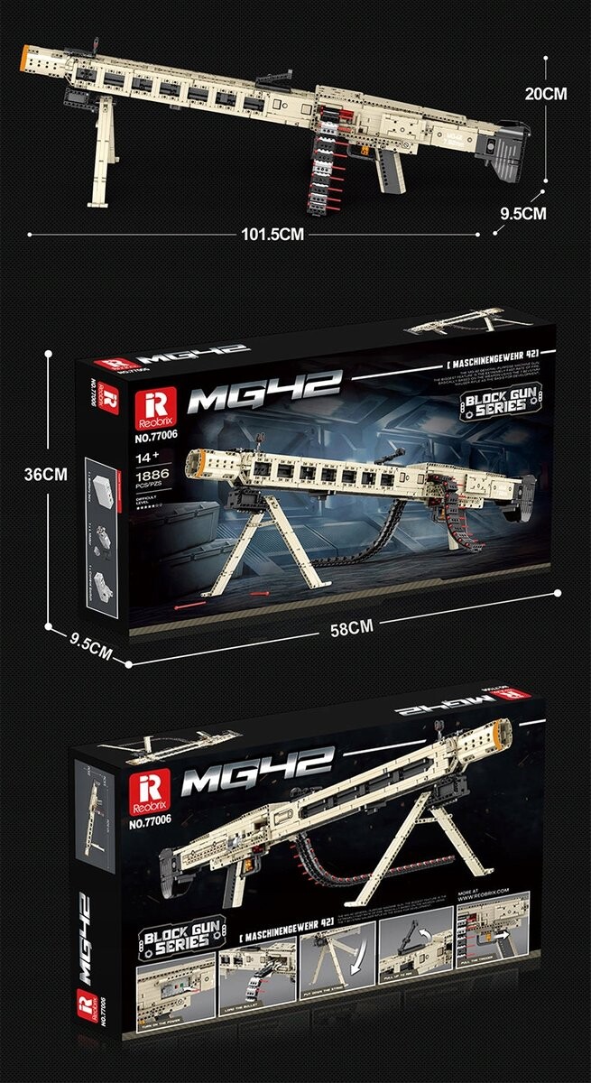 Перенеситесь в мир истории и военной точности с набором Универсальный пулемет Reobrix MG-42 ! Этот уникальный набор, состоящий из 1886 элементов, MG-42 и по сей день считается одним из лучших пулеметов в истории.