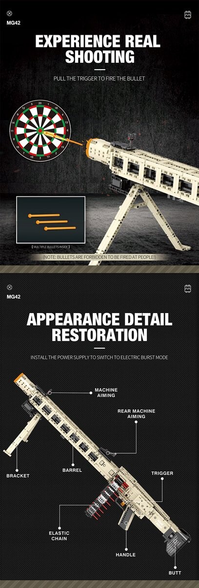 Благодаря системе крепления его можно было использовать в различных конфигурациях – от огневых позиций до бронетехники. MG-42 — легендарный пулемет, использовавшийся во многих конфликтах по всему миру. Благодаря тщательному дизайну и вниманию к деталям эта модель отражает каждый аспект оригинального оружия. от характерного ствола до реалистичных деталей. Прежде всего, у модели имеется боекомплект в виде дротиков, обеспечивающий подавляющее преимущество над противником!