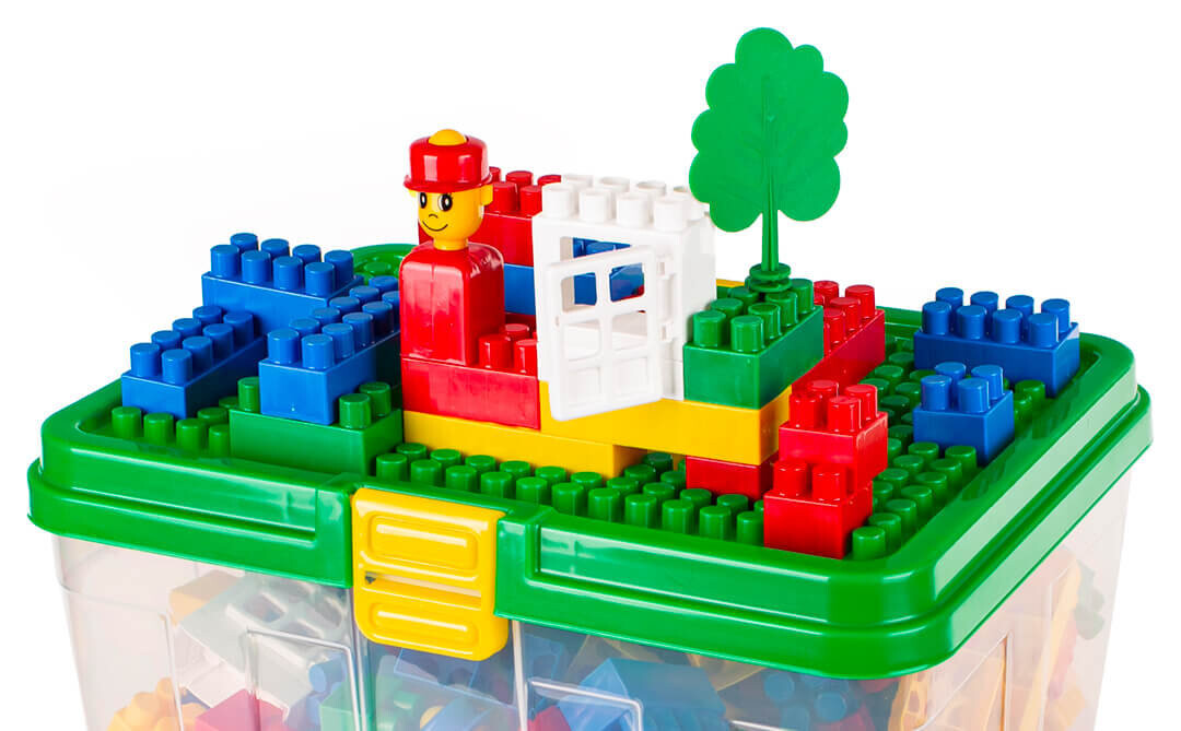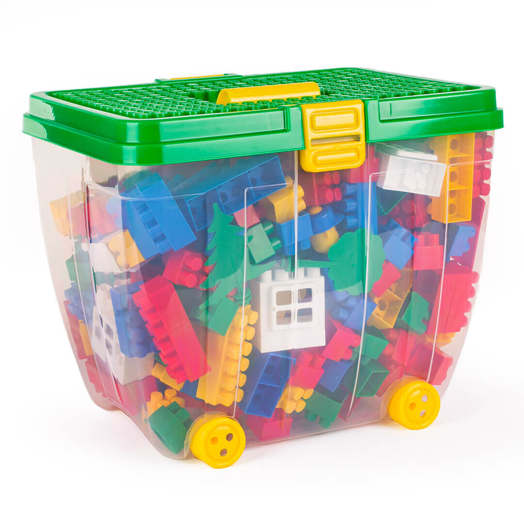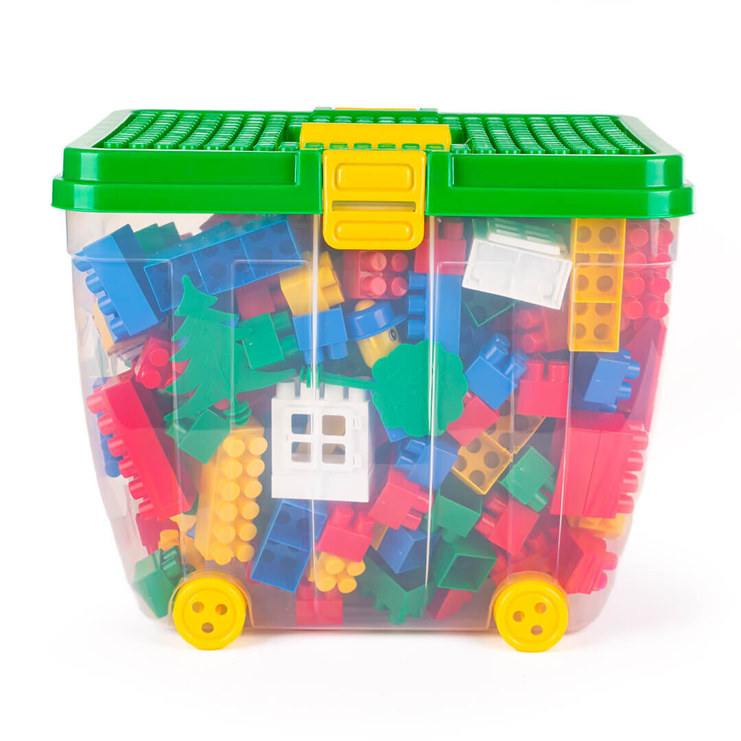 Набор блоков польского бренда Hemar заключенных в пластиковую коробку размером 39х29х31 см, которая наполнена различными элементами – от классических блоков до дополнительных аксессуаров, таких как крыши, двери, фигурки. Пластиковый кейс – идеальное место не только для хранения кубиков, но и других игрушек. Благодаря своему эстетичному дизайну он станет украшением детской комнаты. Каждый контейнер имеет колеса и ручку, благодаря чему его легко переносить. Коробка, контейнер для блоков, имеет плоскую крышку с выступами, на которых можно размещать блоки. Крышку кейса можно использовать как подставку. столешницу для штабелирования блоков или снимите крышку и используйте ее отдельно на земле или на столе.