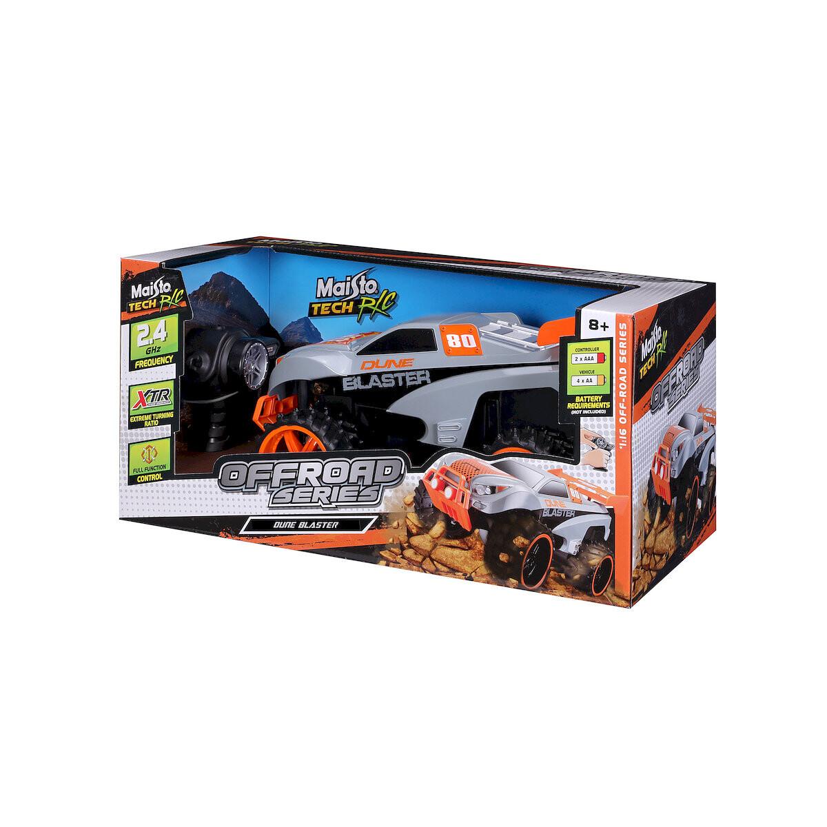 1:16 OFF ROAD - DUNE BLASTER1/4 Автомобиль Maisto Dune Blaster изготовлен из ударопрочного пластика. Автомобиль работает на частоте 2,4 ГГц и оснащен большими внедорожными шинами. С помощью пульта управления автомобилем можно управлять на расстоянии до 35 метров! управление Благодаря полнофункциональному пульту можно заставить машину двигаться вперед, назад, вправо и влево. Не забывайте, что есть еще регулировка руля: частота! : Способ зарядки 2,4G (4 игрока) : Измерители дальности B/O : Скорость 35 км : 9,0 рабочего времени : B/O