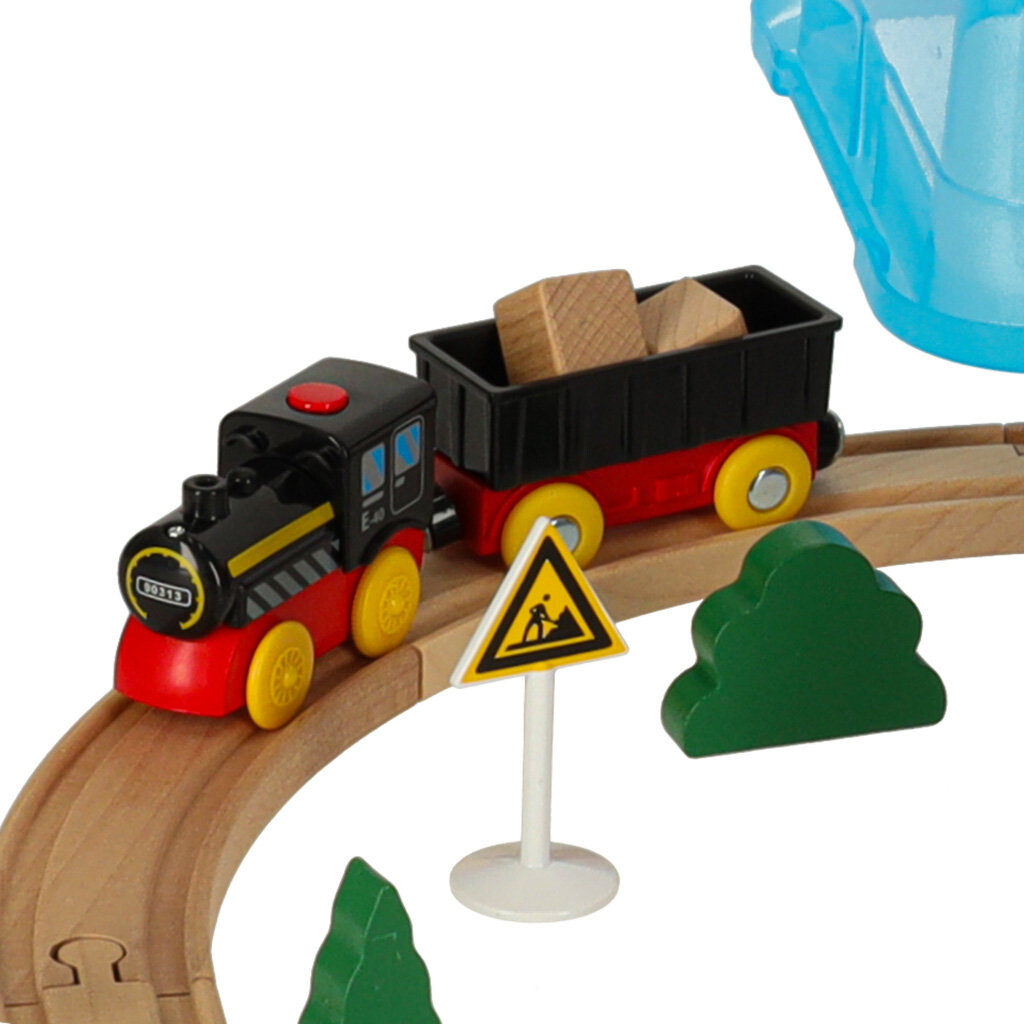 большой путь с самоходным поездом – деревянный поезд самостоятельно передвигается по рельсам, поэтому ребенок может наблюдать за тем, как транспортное средство движется по маршруту, который складывается его любознательность и зрение