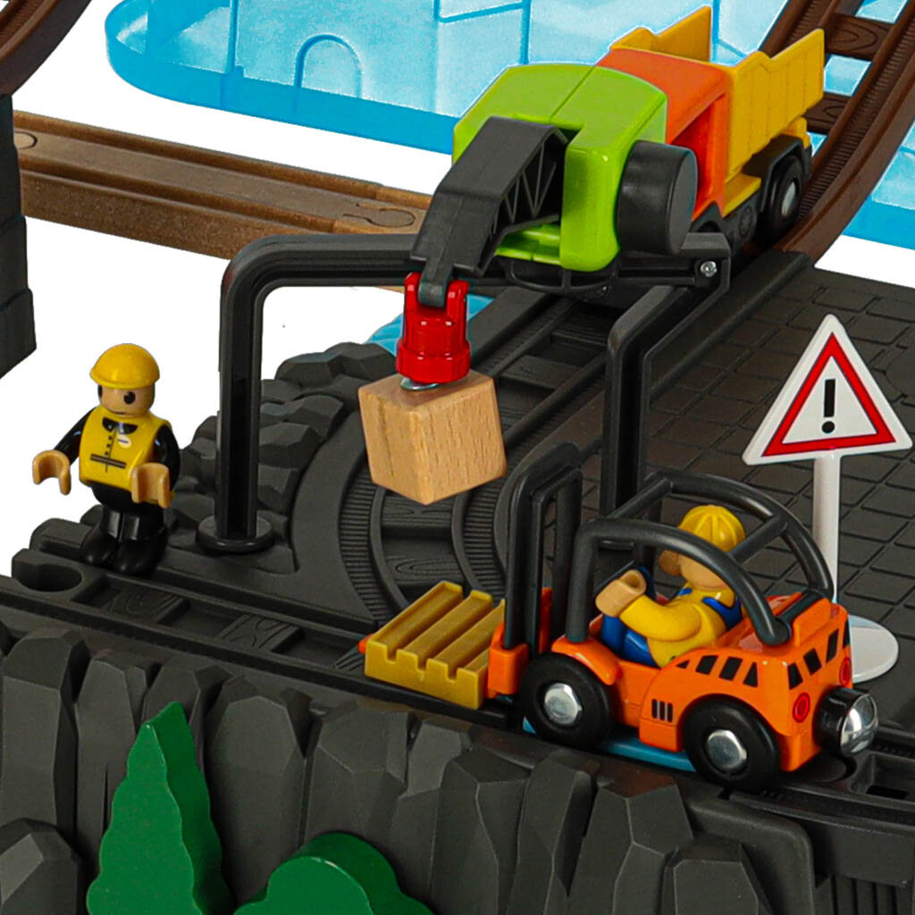 На одной горке стоит кран , который помогает разгружать или погружать грузы из поезда – сценарий игры зависит от фантазии ребенка. Аксессуары, такие как дорожные знаки, конусы. деревья и фигуры позволяют дополнить пейзаж вокруг построенной дорожки.
