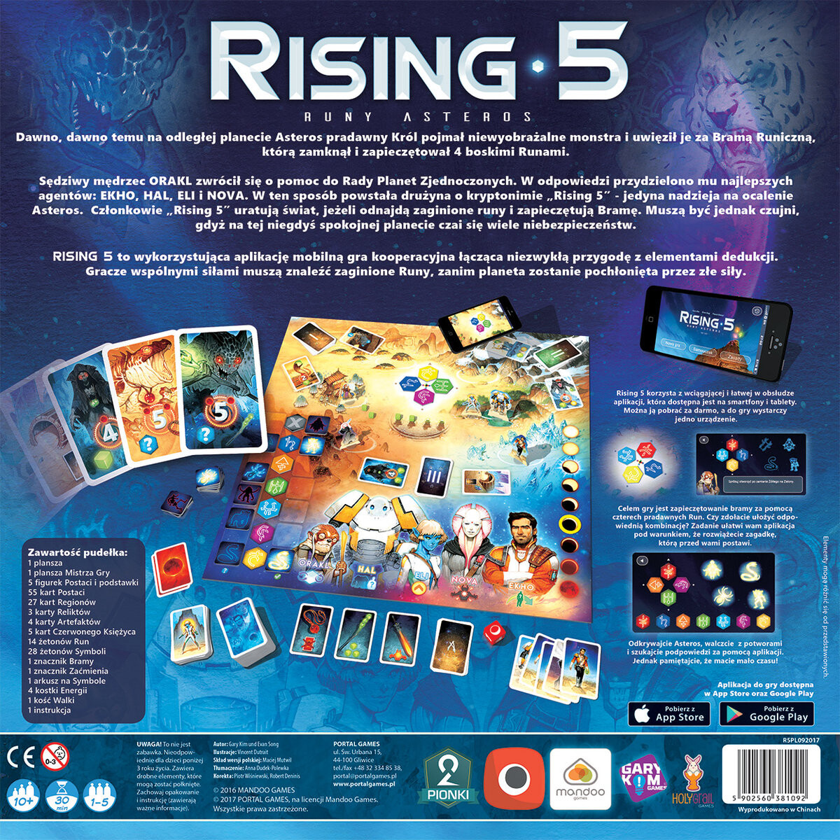 «Rising 5» — это кооперативная игра с использованием мобильного приложения, сочетающая в себе необыкновенное приключение с элементами дедукции. Вместе игроки должны найти недостающие Руны, прежде чем планета будет поглощена силами зла. Участники Rising 5 спасут мир если они найдут недостающие руны и запечатают Врата. Однако им следует быть бдительными, так как на этой когда-то мирной планете подстерегает множество опасностей. . .