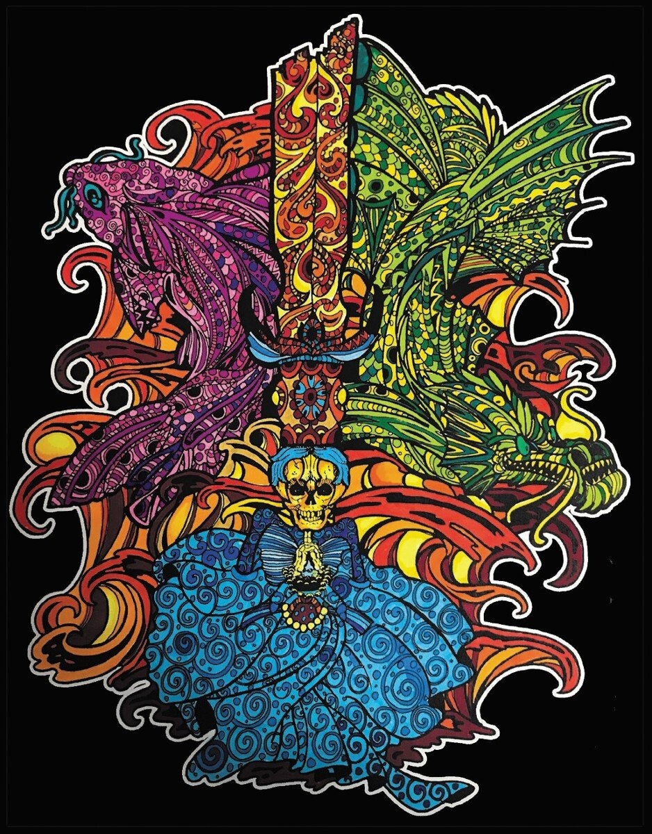 Карп и Дракон - раскраска с бархатистыми контурами (обтянуты черным бархатом)