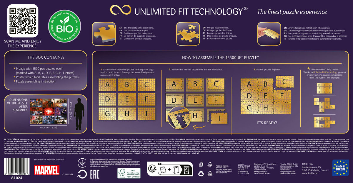 Пазлы из серии Trefl Prime созданы для настоящих любителей головоломок. Специальная технология позволяет объединить любое количество изображений в одну большую композицию! Более того, благодаря использованию плотнейшего картона, уникальной формы пазла и особого метода вырезания, вы сможете легко передвигать весь пазл. Продукт сертифицирован FSC и все пластиковые элементы, используемые для его упаковки, являются компостируемыми и биоразлагаемыми. Создайте свой индивидуальный коллаж с помощью пазлов Trefl Prime!
