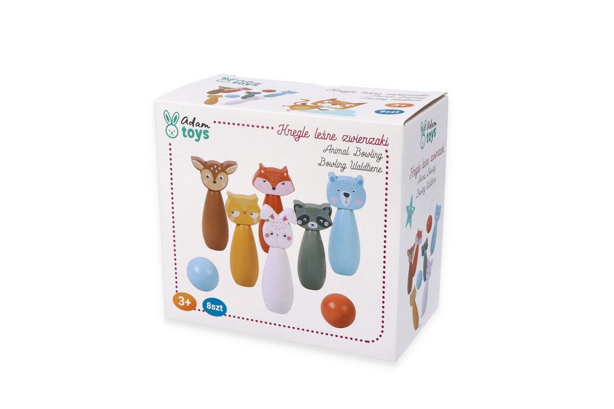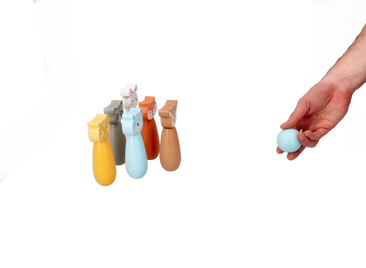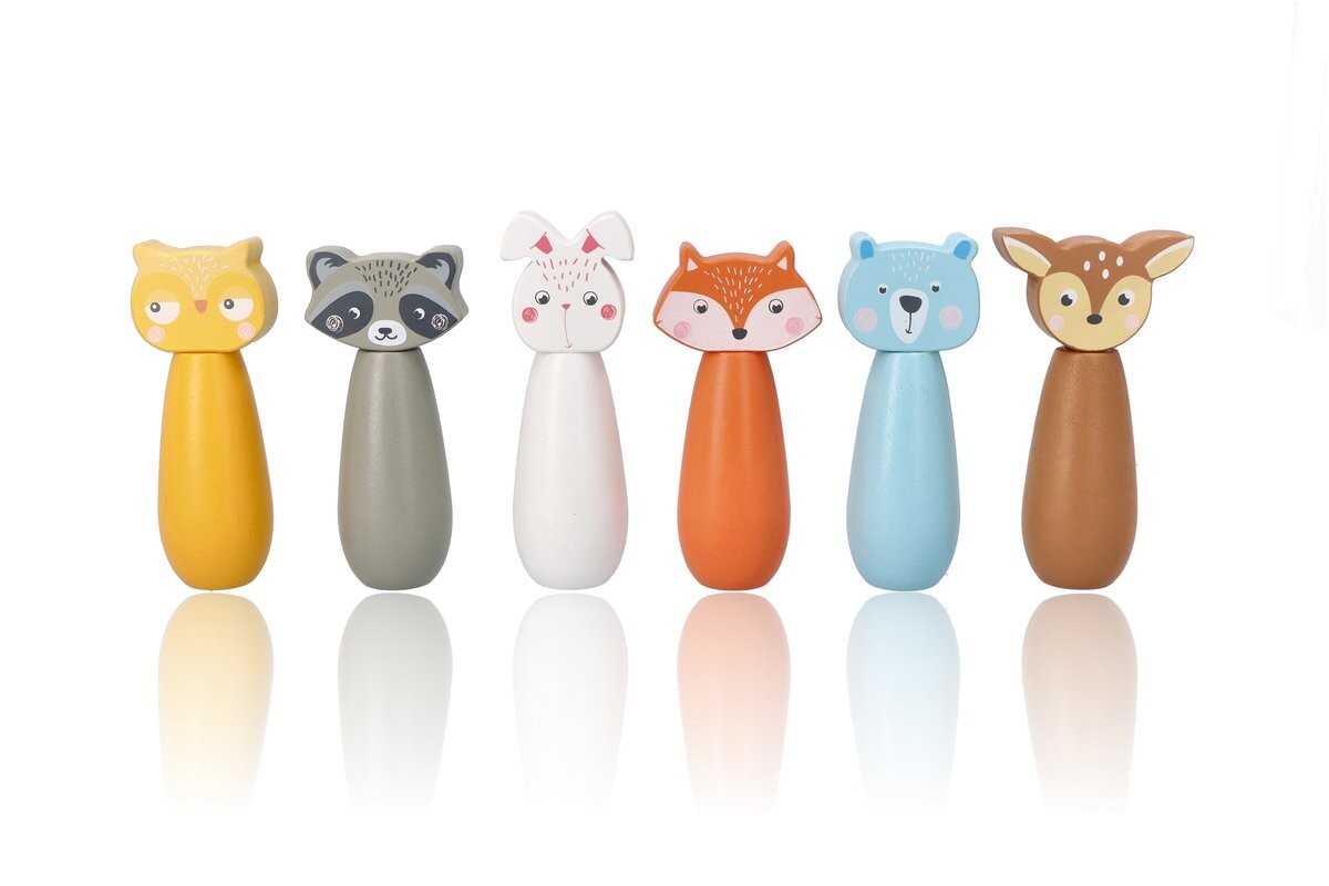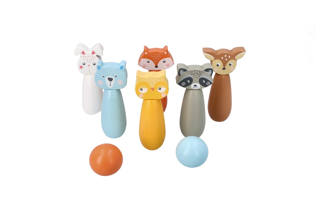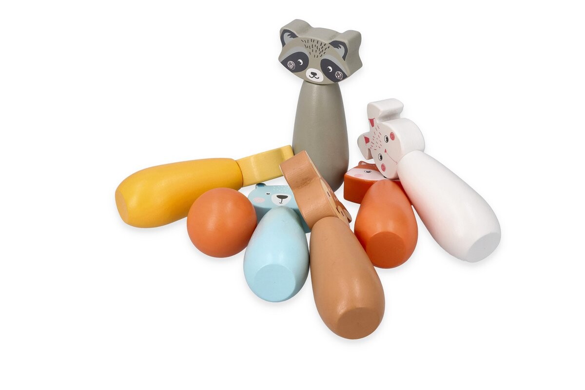 Кегли и шары для боулинга полностью сделаны из дерева. Красиво сделанные и раскрашенные в яркие, приятные цвета, они подтолкнут вас к игре, а милые фигурки также могут стать украшением полки. Здесь вы встретите 6 лесных животных: лису, плюшевого мишку, енота, оленя, сову и зайчика.