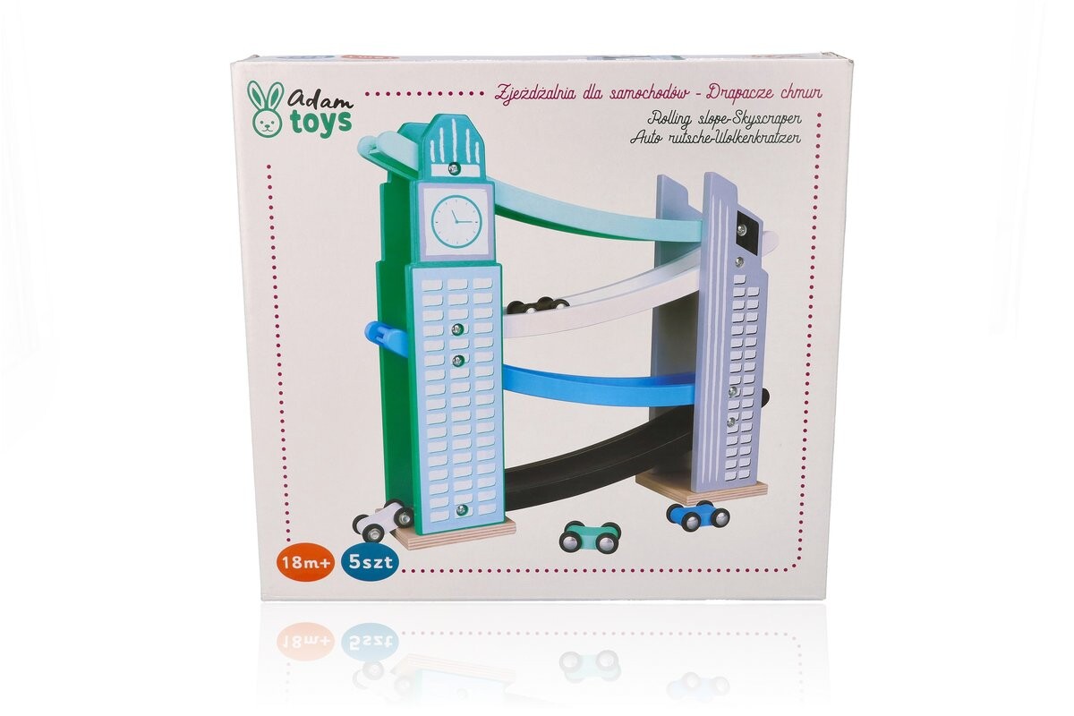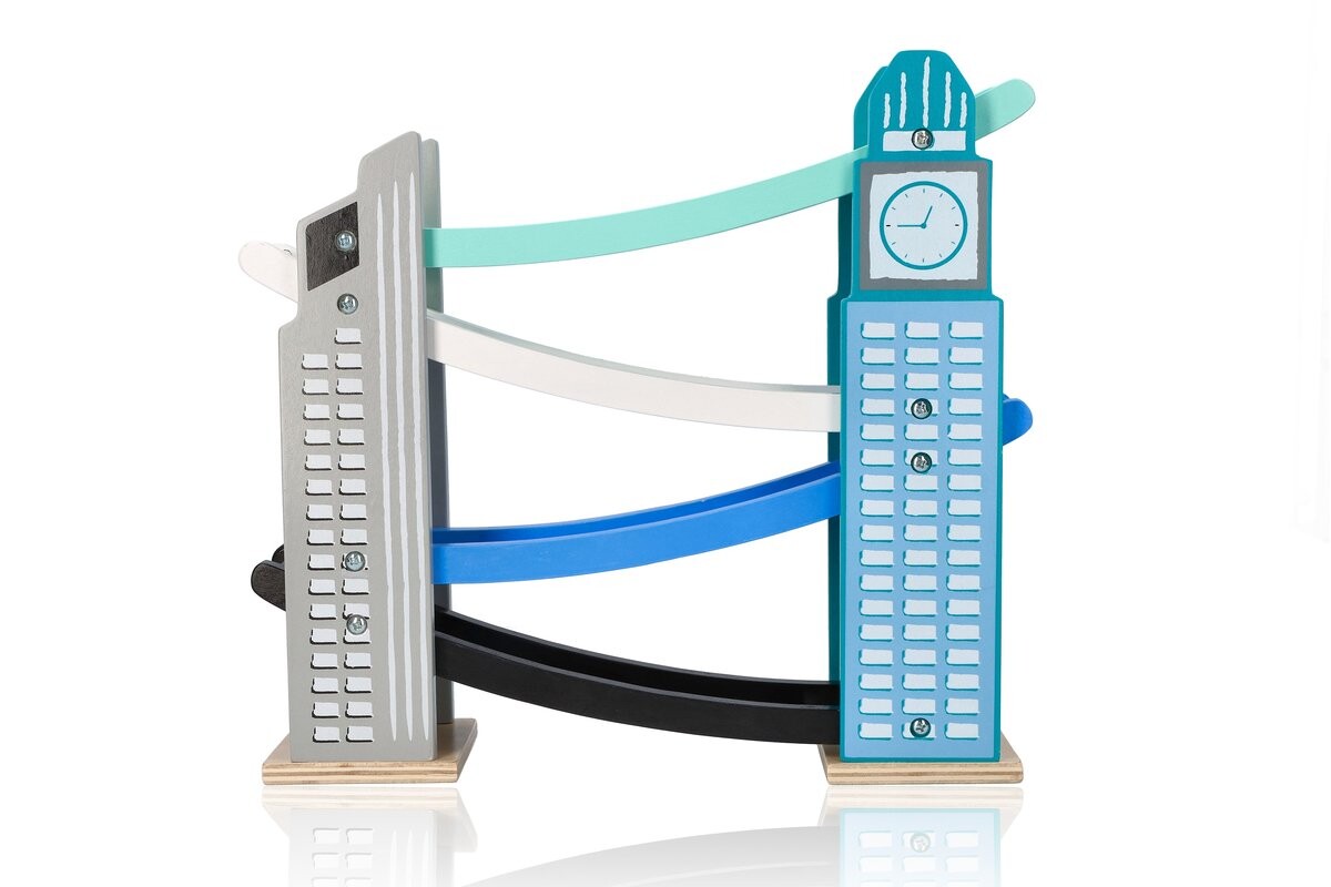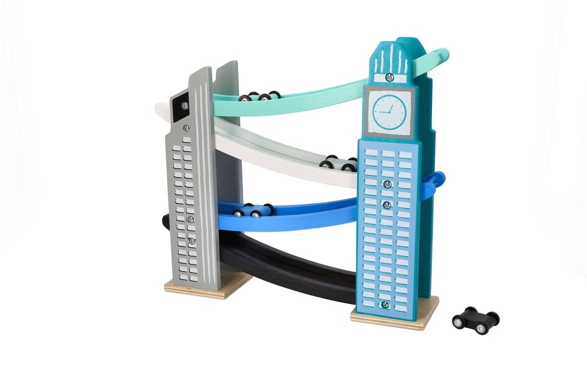 Добро пожаловать в современный город. Над районом возвышаются металлические и стеклянные небоскребы, которые можно увидеть издалека. Между ними мчатся машины. Этот красивый небоскреб – классическая игрушка в новой версии. Просто поставьте машину сверху, и она полетит вниз, кувыркаясь на каждом этаже.