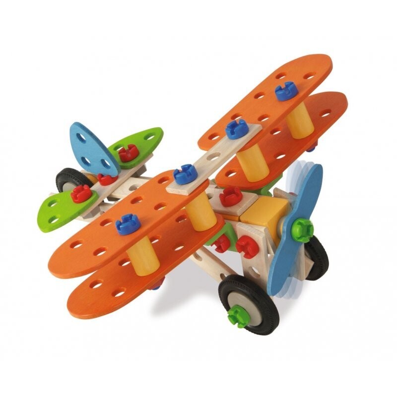 Материал – дерево бук и пластиковые элементы. В наборе 85 деревянных элементов, включая строительные блоки, винты, соединители, инструкции и многое другое, благодаря которым вы сможете построить динозавра, мотоцикл и 2 типа самолетов (биплан и водный вертолет), а также создать свой собственный. проект.