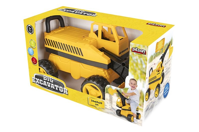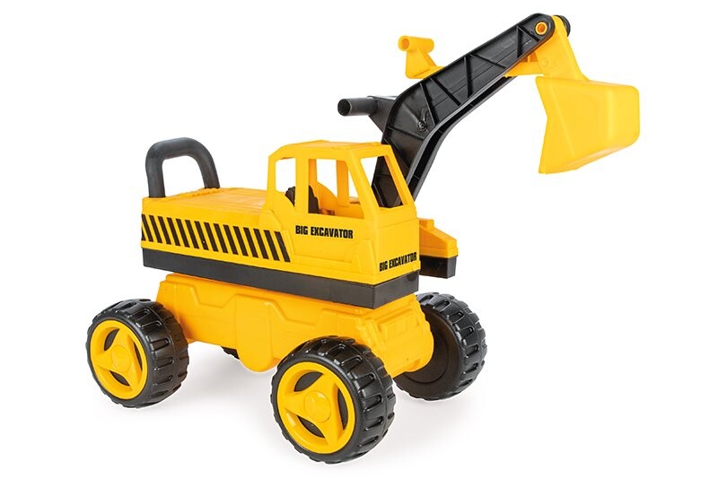 Большой экскаватор, на котором сможет кататься ребенок. Здесь есть специальное место для отдыха. Вращается на 360 градусов. Перемещать ковш экскаватора можно благодаря специальным ручкам. Экскаватор имеет низкую спинку. Поворотные пластиковые колеса имеют четко выраженный протектор. Игрушка легкая для своего размера. Это облегчает движение вперед. Транспортное средство также служит идеальным сиденьем для игровой площадки.