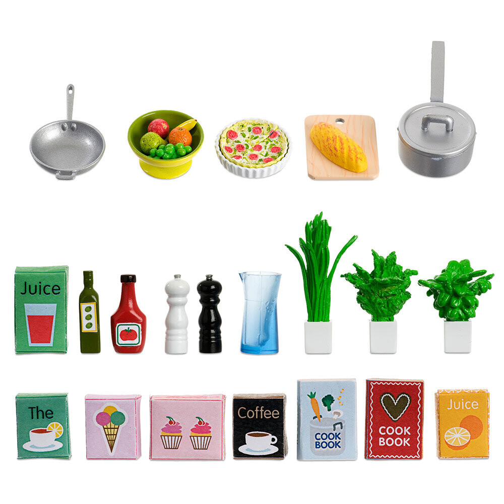 Пригласите друзей на ужин на кухне или на прекрасный обед в саду! Здесь вы найдете множество интересных кухонных аксессуаров. В этот набор входят вок, ваза с фруктами, торт, хлеб, разделочная доска, сковорода, мельницы для соли и перца, кувшин, травы, кетчуп, оливковое масло, сок и множество других продуктовых наборов и кулинарных книг.